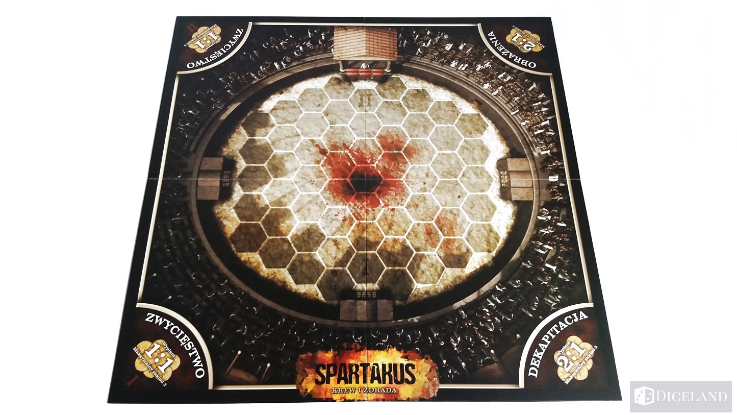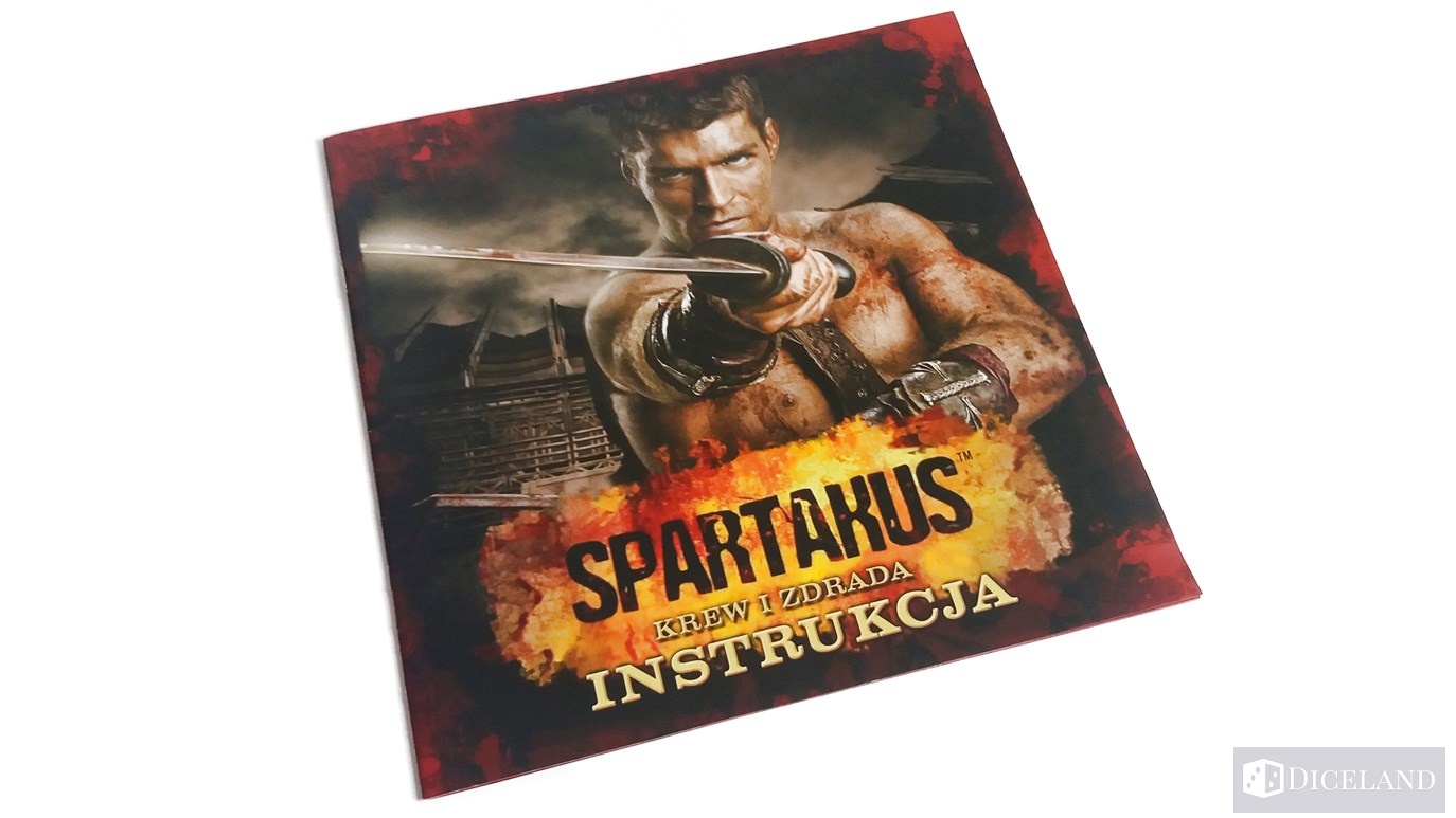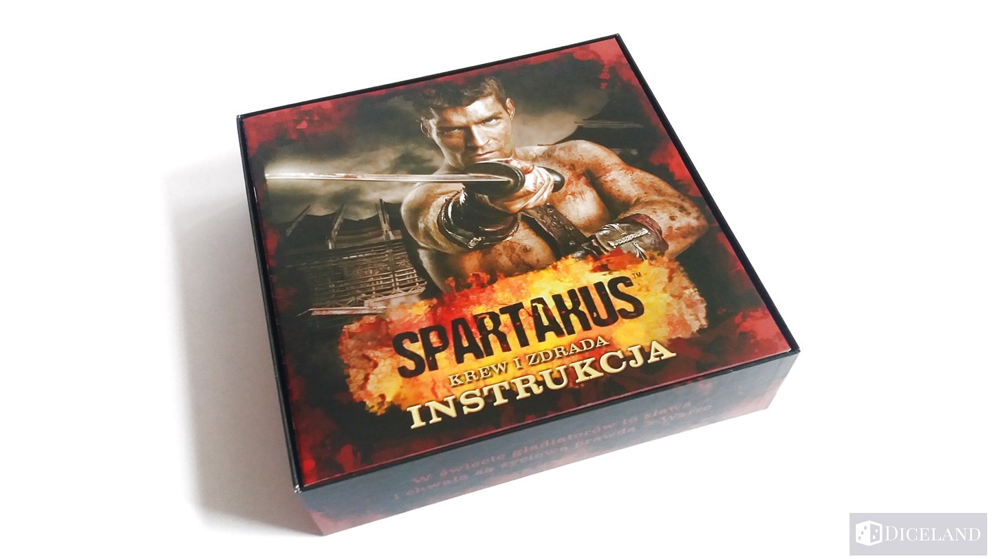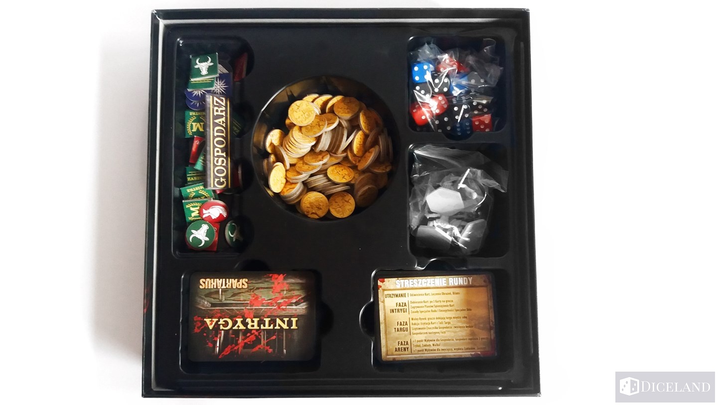 Po otworzeniu niestandardowych rozmiarów pudełka do gry Spartakus, które na okładce zawiera tytułowego bohatera, ujrzymy instrukcję do gry, a zaraz pod nią planszetki graczy i planszę areny. Po ich wyjęciu wyłania nam się świetna wypraska na wszystkie elementy gry.