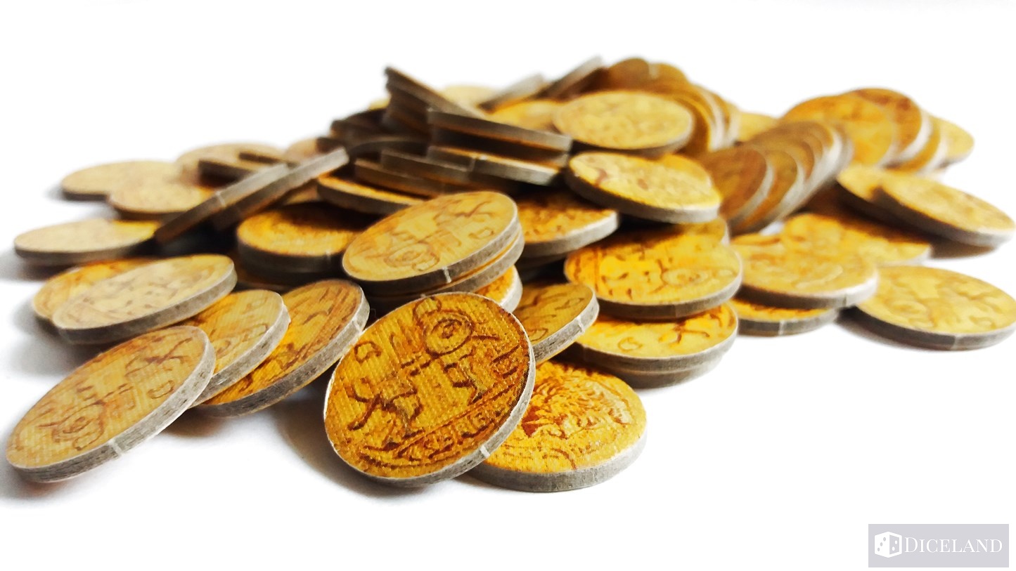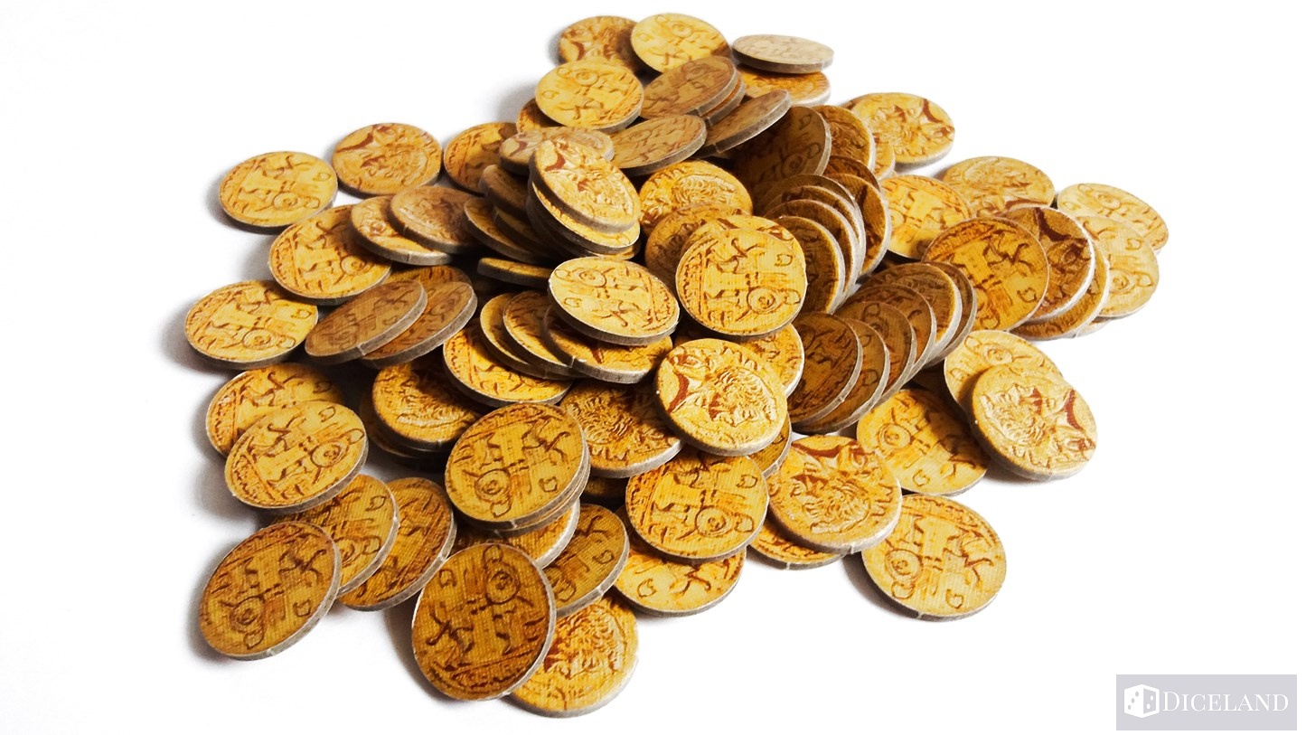 Żetony złota, które podczas gry możemy przechowywać w specjalnie przygotowanym miejscu w wyprasce.