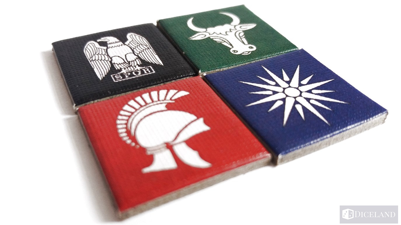 Każdy ród posiada różne dobra początkowe w postaci złota, gladiatorów, strażników i niewolników. Należy je pobrać i ułożyć w odpowiednich miejscach przy planszetce naszego rodu. Początkowi gladiatorzy i niewolnicy są oznaczeni specjalną białą ramką i są wyraźnie słabsi od pozostałych, których zdobędziemy w trakcie gry. Najważniejszą kwestią, którą musicie ustalić ze współgraczami, to przewidywany czas rozgrywki. Możemy zdecydować się na 3 warianty: