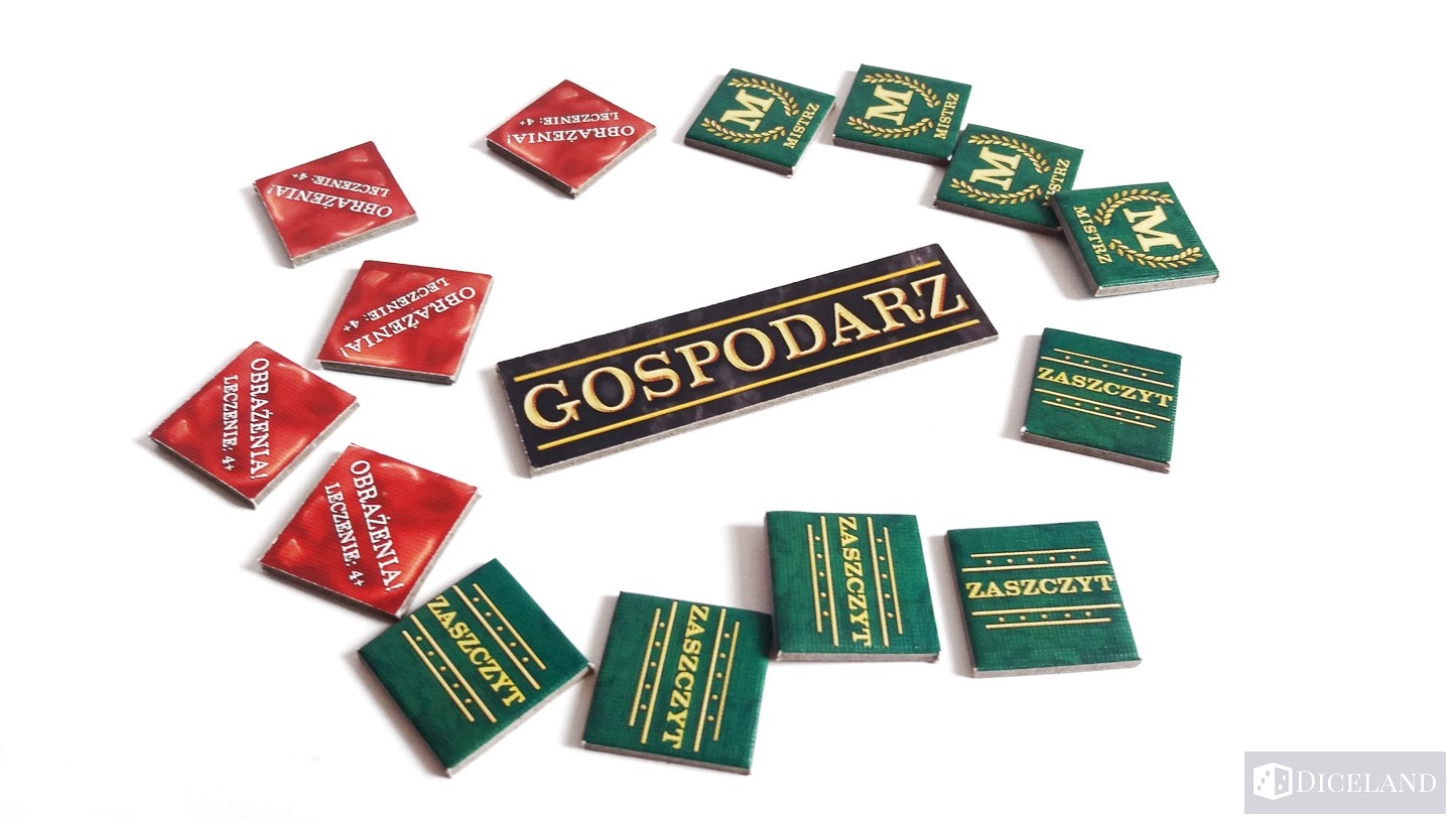Pozostałe żetony w pudełku to: dwustronne żetony obrażeń/zaszczytu, żetony mistrza, żetony rodów i znacznik gospodarza.