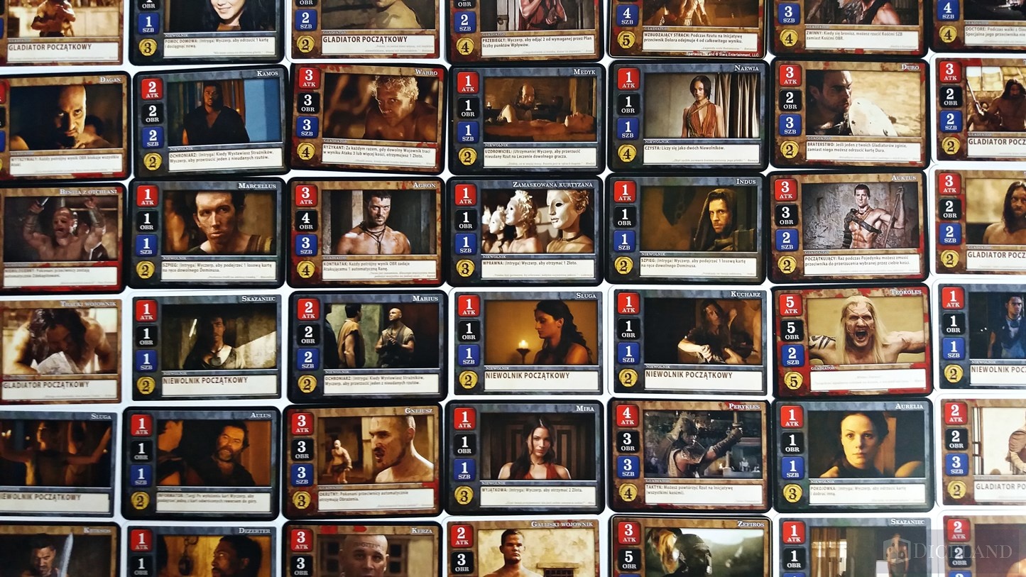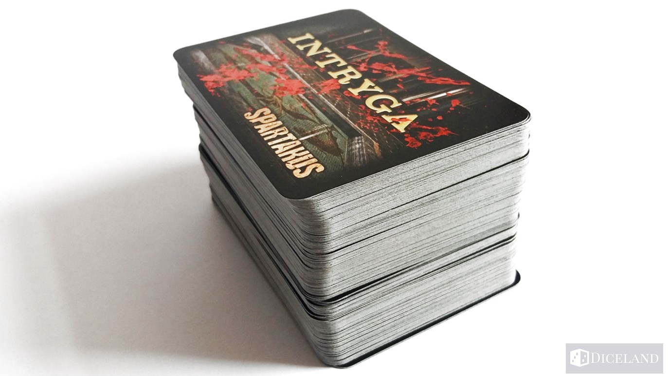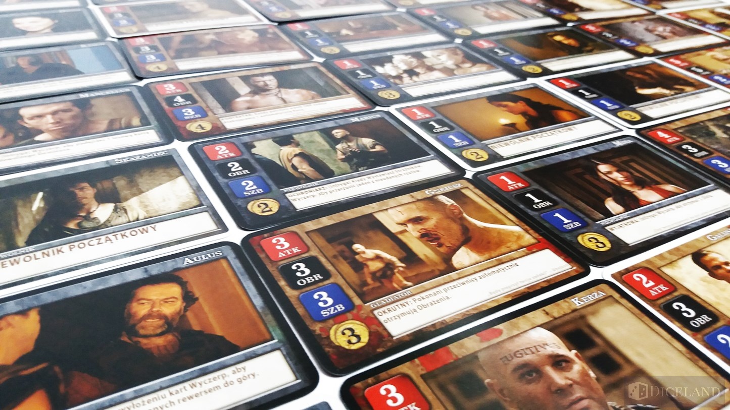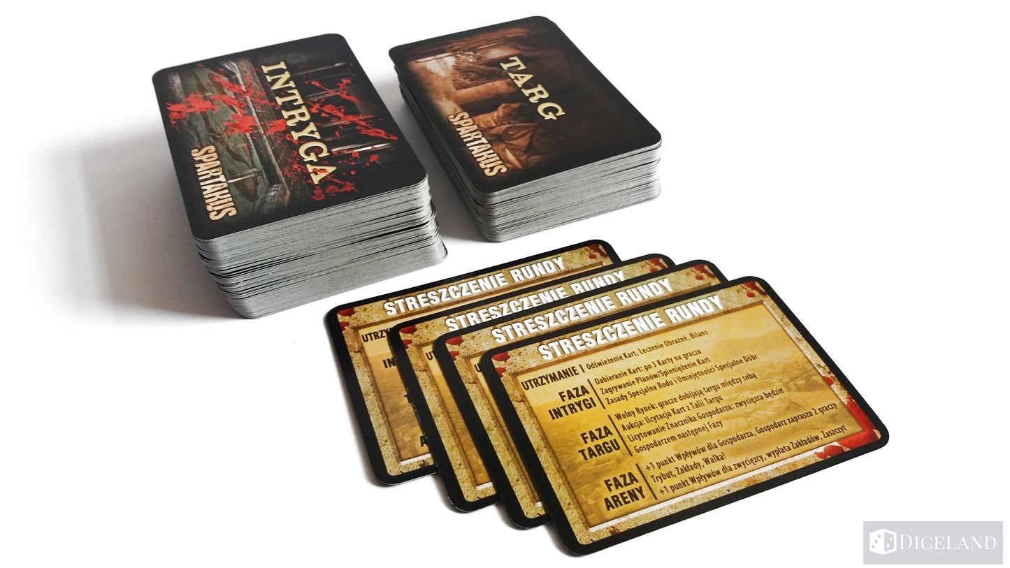 166 kart podzielonych na 104 karty intrygi, 62 karty targu i 4 karty ze streszczeniem rundy, służące jako pomoc dla graczy. Na kartach targu znajdziemy części wyposażenia, niewolników i gladiatorów posiadające ilustracje i kadry z serialu. Natomiast karty intryg posłużą nam do wszelkiego rodzaju kombinacji w grze, znajdziemy tam również karty strażników, które ochronią nas przed działaniem kart intryg.