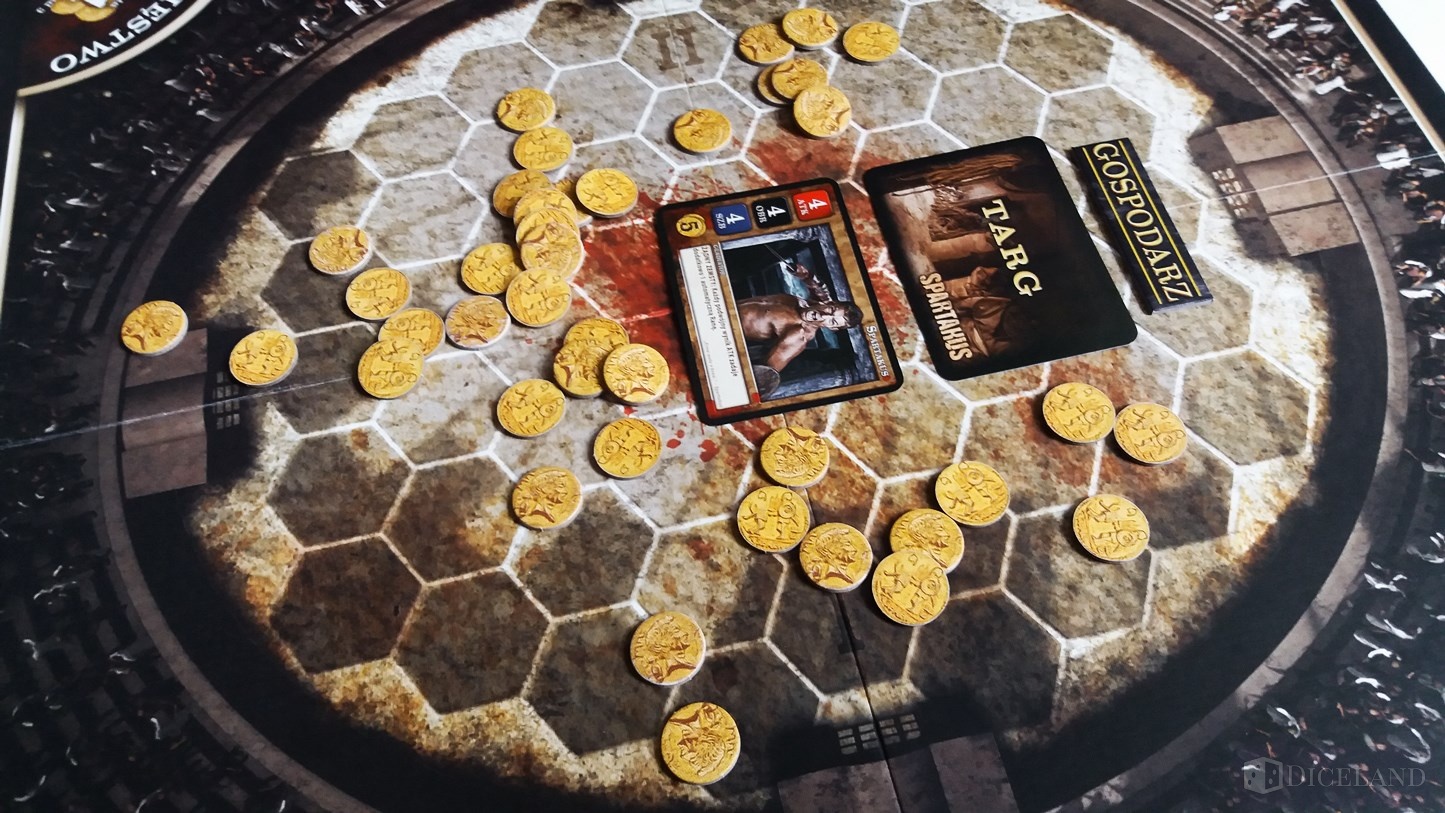 - Faza targu – w tej fazie będziemy walczyli poprzez licytację o najróżniejsze dobra: niewolników, gladiatorów i cenne wyposażenie. Powalczymy również o tytuł gospodarza, który zorganizuje najbliższą fazę areny.