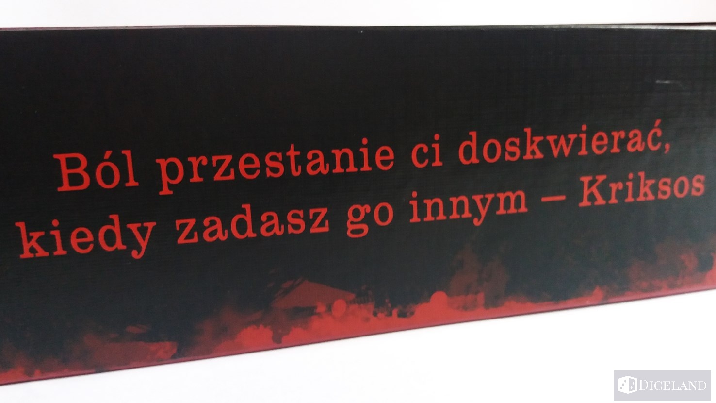 Na pudełku widnieją klimatyczne cytaty, prawdopodobnie wyciągnięte prosto z serialu (nie oglądałem wszystkich odcinków) oraz informacja o tym, że gra jest zalecana dla osób powyżej 17 roku życia.