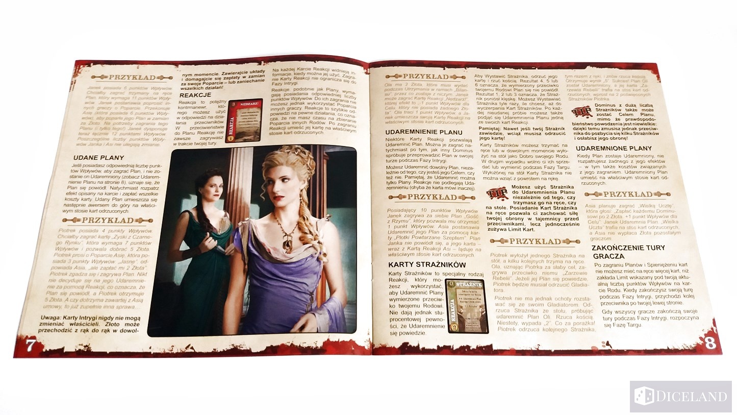 Całość prezentuje się nadzwyczaj dobrze. Ilustracje pomagają wczuć się w klimat gry, jednak nie każdemu się one spodobają. Kości jak to kości, mamy ich 3 kolory i spełniają się po prostu w swojej roli. Klimat gry wręcz wylewa się z pudełka. Już na samej okładce mamy głównego protagonistę serialu, a jego postać pojawia się na jednej z kart gladiatorów. Każdy fragment rozgrywki jest bardzo klimatyczny i faktycznie możemy się wczuć w spiskujących dominusów.