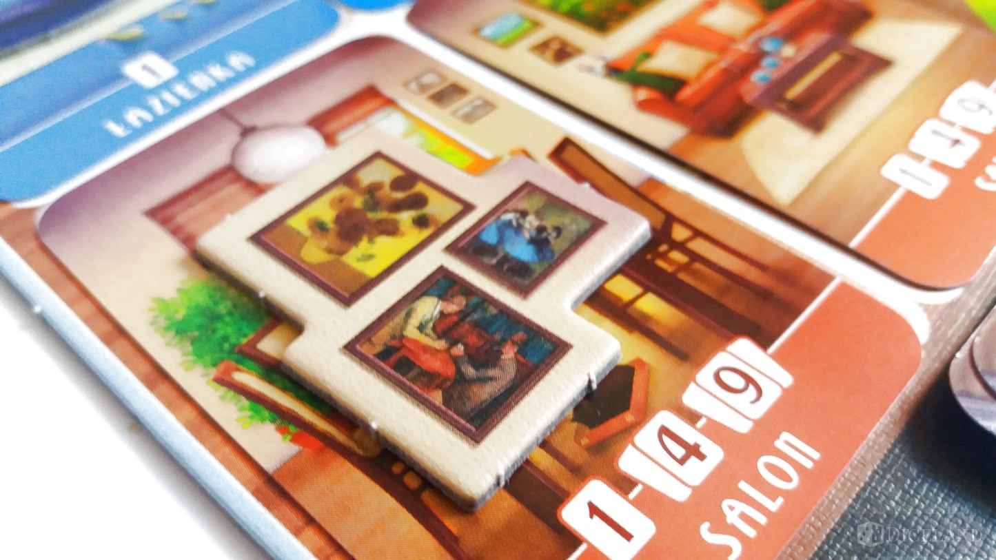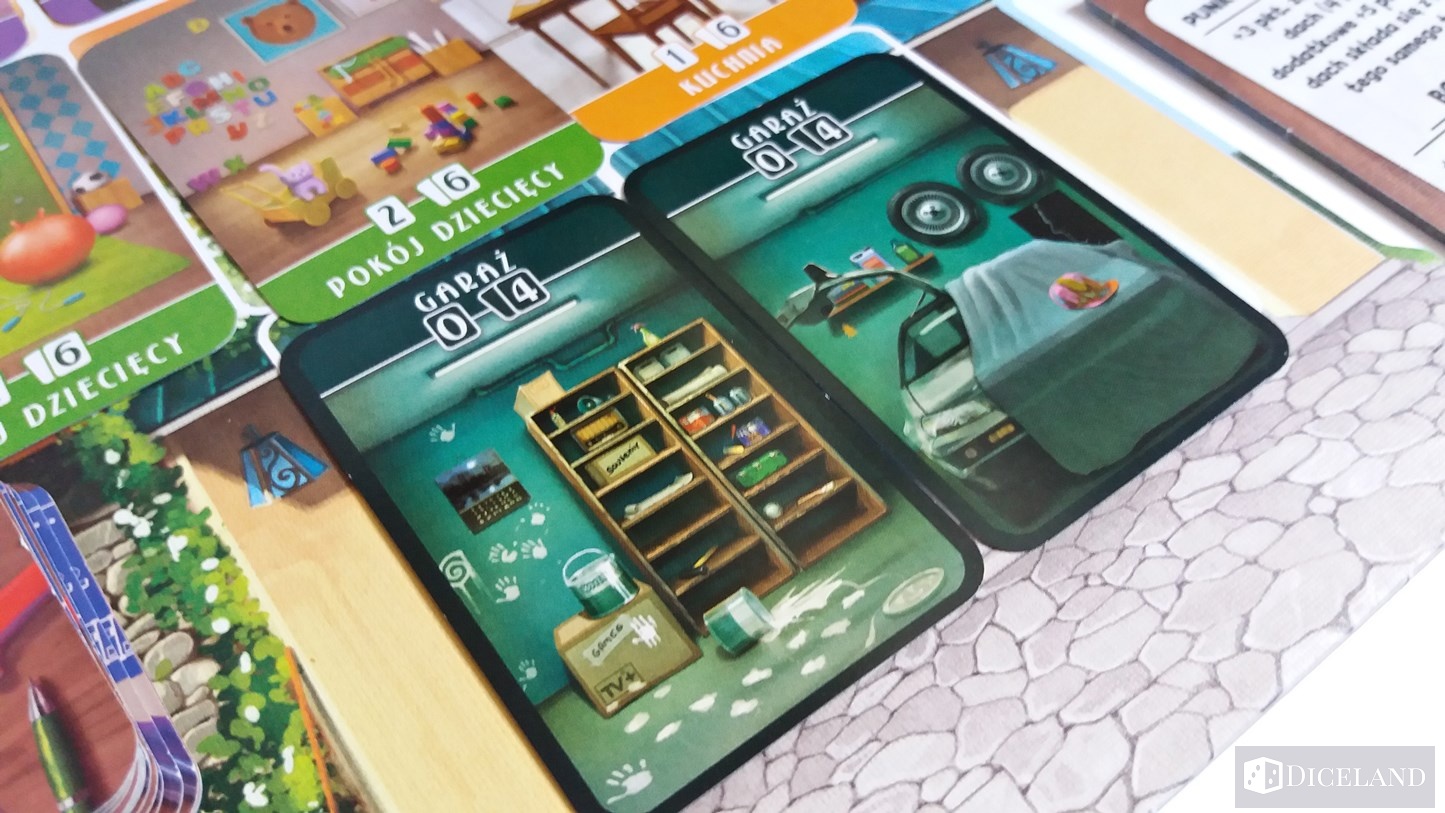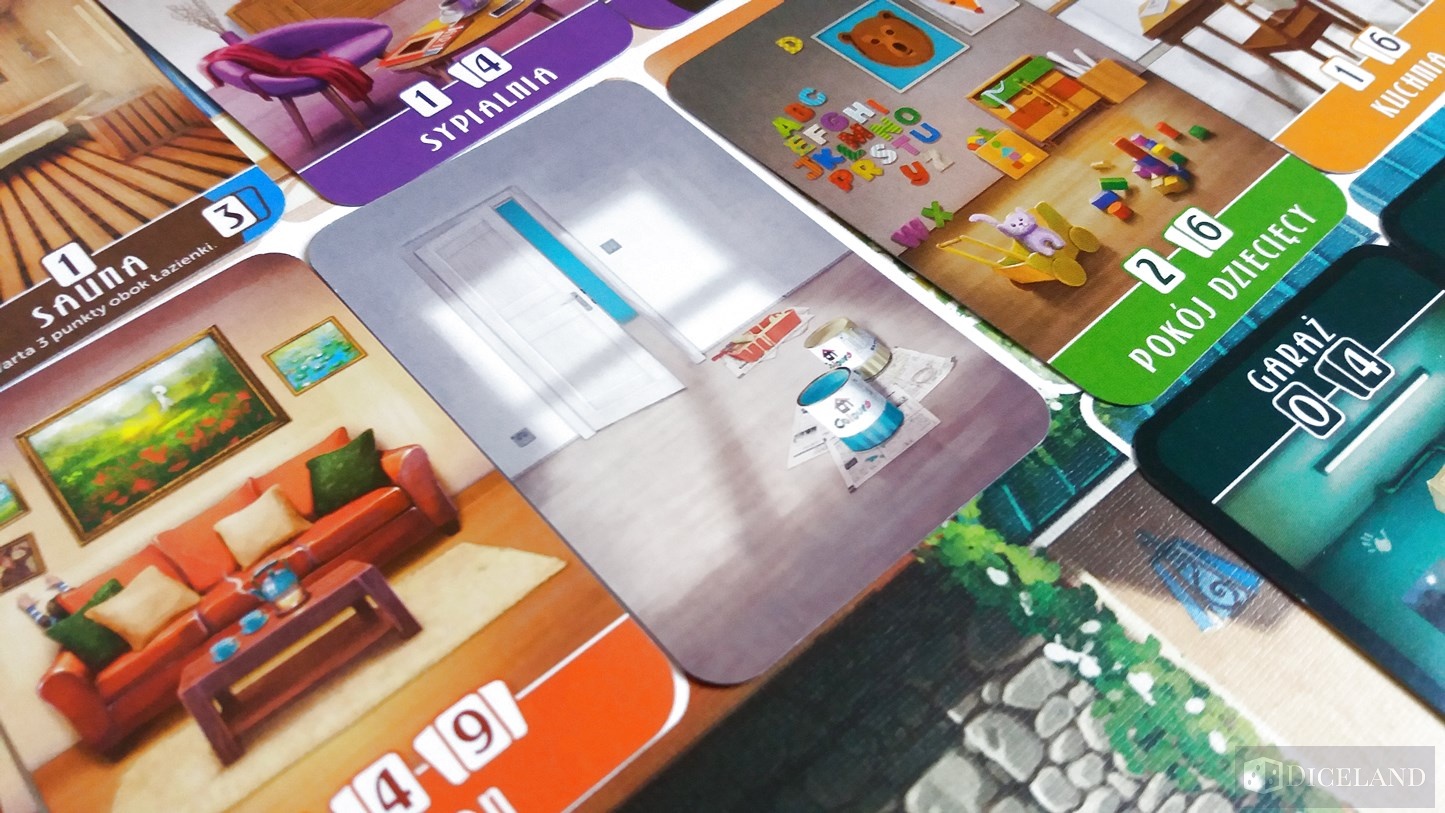 Głównym elementem gry są jednak karty. Na ich awersach znajdziemy różnego rodzaju pomieszczenia i aneksy, typu kuchnia, salon, łazienka, garaż i wiele innych. Każde pomieszczenie, nawet w ramach tego samego rodzaju jest ilustrowane inaczej. Zostały one skonstruowane w taki sposób, że np. dwa pomieszczenia kuchenne, pomimo tego że różnią się od siebie, to jednocześnie do siebie pasują. Najważniejsze na co należy zwrócić uwagę, to przede wszystkim ich wykonanie – są one po prostu śliczne. Karty te zrobiły na mnie ogromnie pozytywne wrażenie.