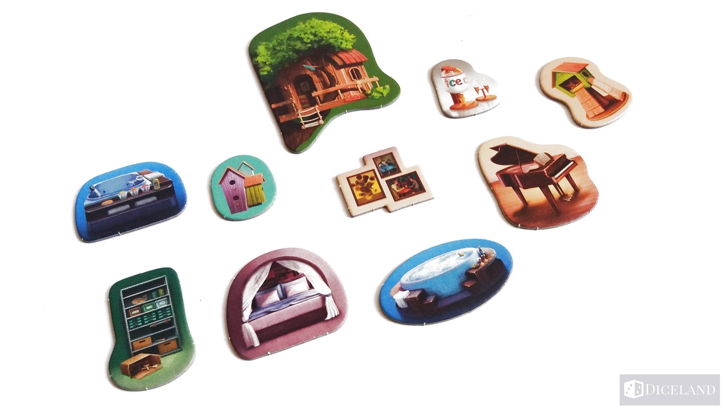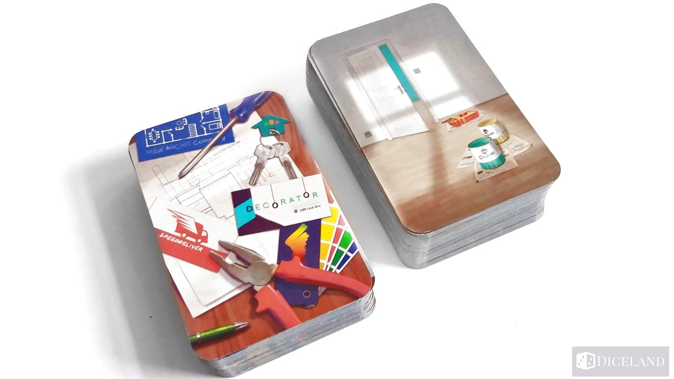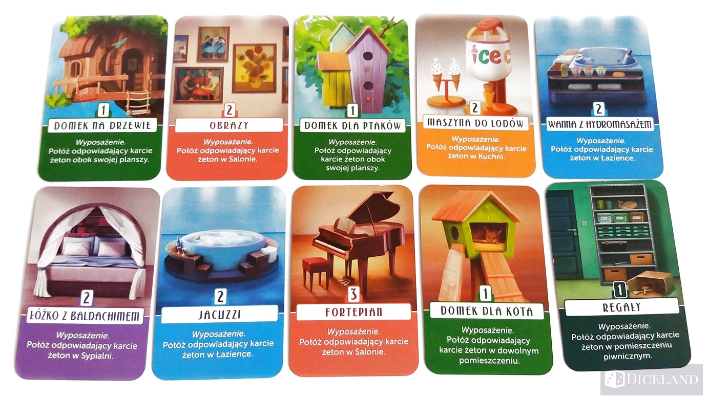 Głównym elementem gry są jednak karty. Na ich awersach znajdziemy różnego rodzaju pomieszczenia i aneksy, typu kuchnia, salon, łazienka, garaż i wiele innych. Każde pomieszczenie, nawet w ramach tego samego rodzaju jest ilustrowane inaczej. Zostały one skonstruowane w taki sposób, że np. dwa pomieszczenia kuchenne, pomimo tego że różnią się od siebie, to jednocześnie do siebie pasują. Najważniejsze na co należy zwrócić uwagę, to przede wszystkim ich wykonanie – są one po prostu śliczne. Karty te zrobiły na mnie ogromnie pozytywne wrażenie.
