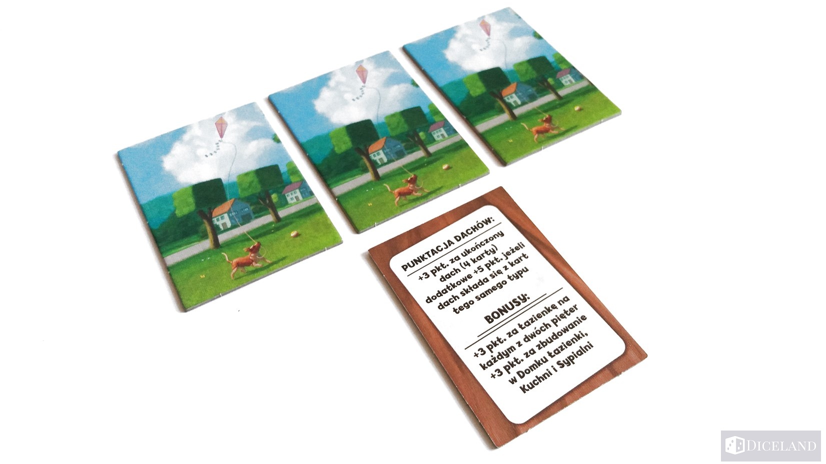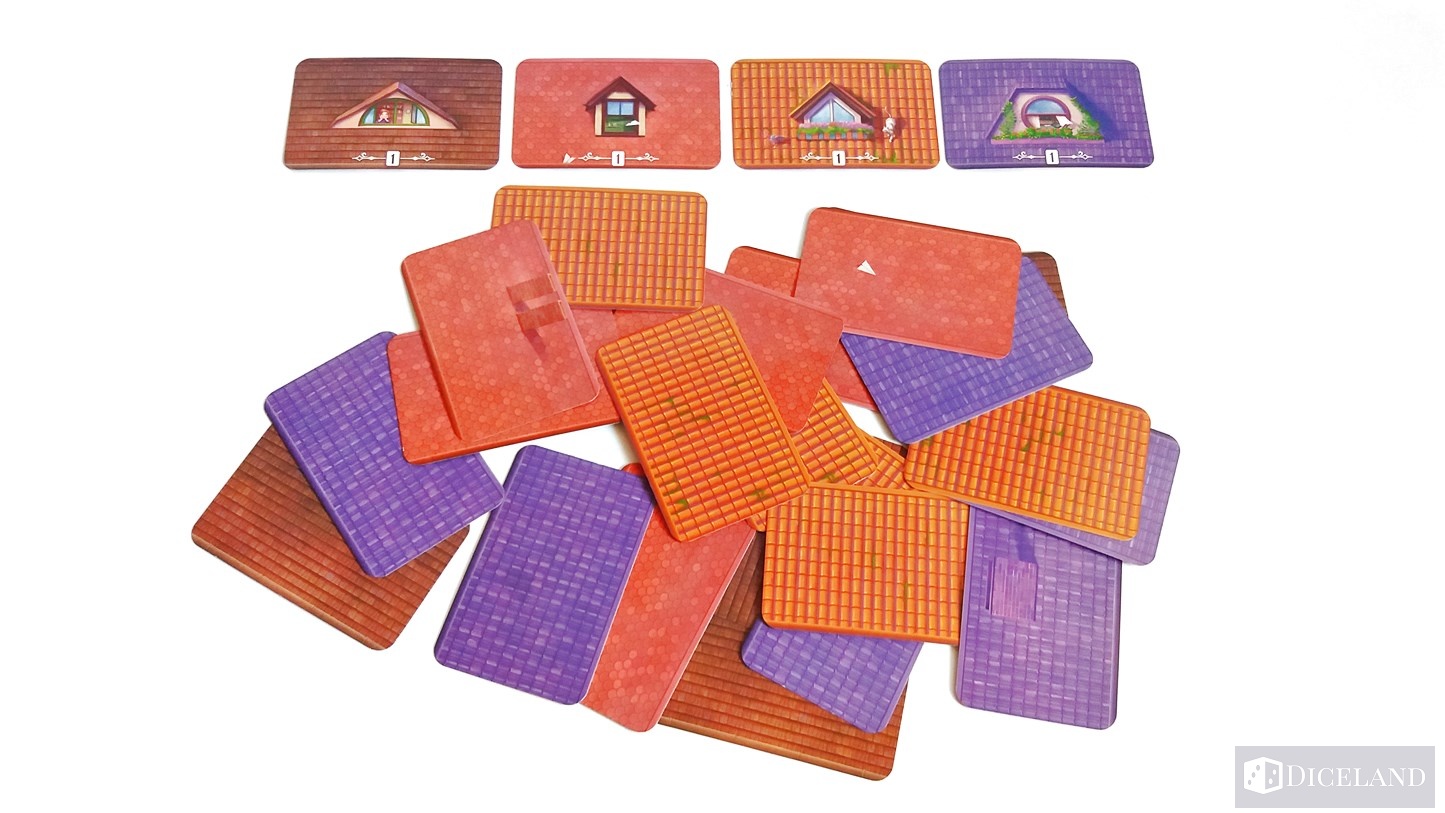 - Karty dachu – będziemy je umieszczali zakryte w odpowiednim miejscu na naszej planszetce. Musimy je zapamiętywać, gdyż nie możemy oglądać już odłożonych kart. Karty dachu przynoszą nam dodatkowe punkty jeśli mamy przynajmniej 4 takie karty. Jeśli mamy ich więcej to wybieramy, które z nich staną się naszym dachem. Najlepiej aby były jednolitego koloru, gdyż wtedy otrzymamy dodatkową bonifikatę. Dodatkowe punkty zgarniemy również jeśli na kartach znajdują się okna.
