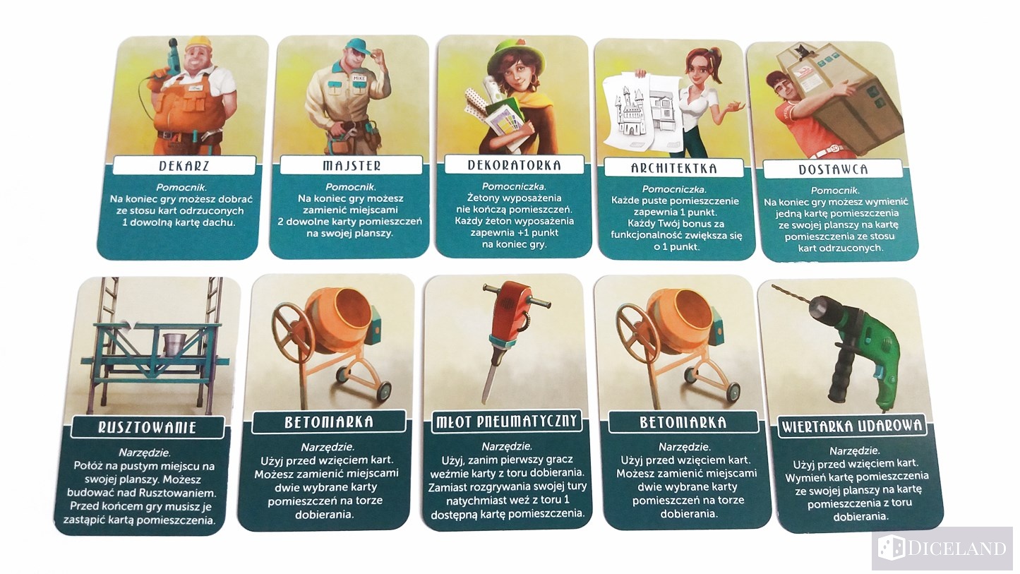 Pozostałe karty to różnego rodzaju wyposażenie wnętrz, narzędzia budowlane pomocne w różnych przypadkach, pomocnicy budowlani oraz karty dachów. Przecież każdy pełnoprawny domek powinien mieć swój dach. Rodzaje kart zostały odróżnione ilustracjami na rewersach. Liczba kart liczy 108 sztuk (60 kart pomieszczeń i 48 kart dodatków).