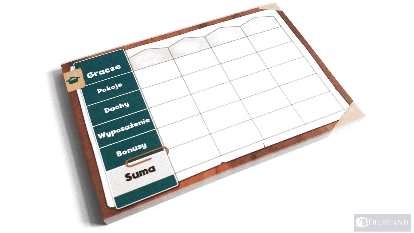 Dodatkowo w pudełku znajdziemy znacznik pierwszego gracza wykonany z drewna i przypominający domek. Specjalne żetony, które odpowiadają kartom dodatkowego wyposażenia. 4 karty pomocy informujące nas o tym za co na koniec gry możemy dodatkowo zapunktować. Ostatnim elementem jest notesik, który ułatwi podliczanie punktów pod koniec rozgrywki.