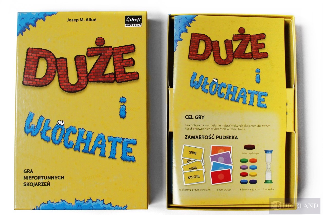 Żółte pudełko z napisem „DUŻE i WŁOCHATE” wygląda zachęcająco. Ceglany napis Duże nawiązanie do Ulicy Sezamkowej, w napisie włochate od razu naprowadza nas na skojarzenie, że gra skierowana jest do młodszych graczy.