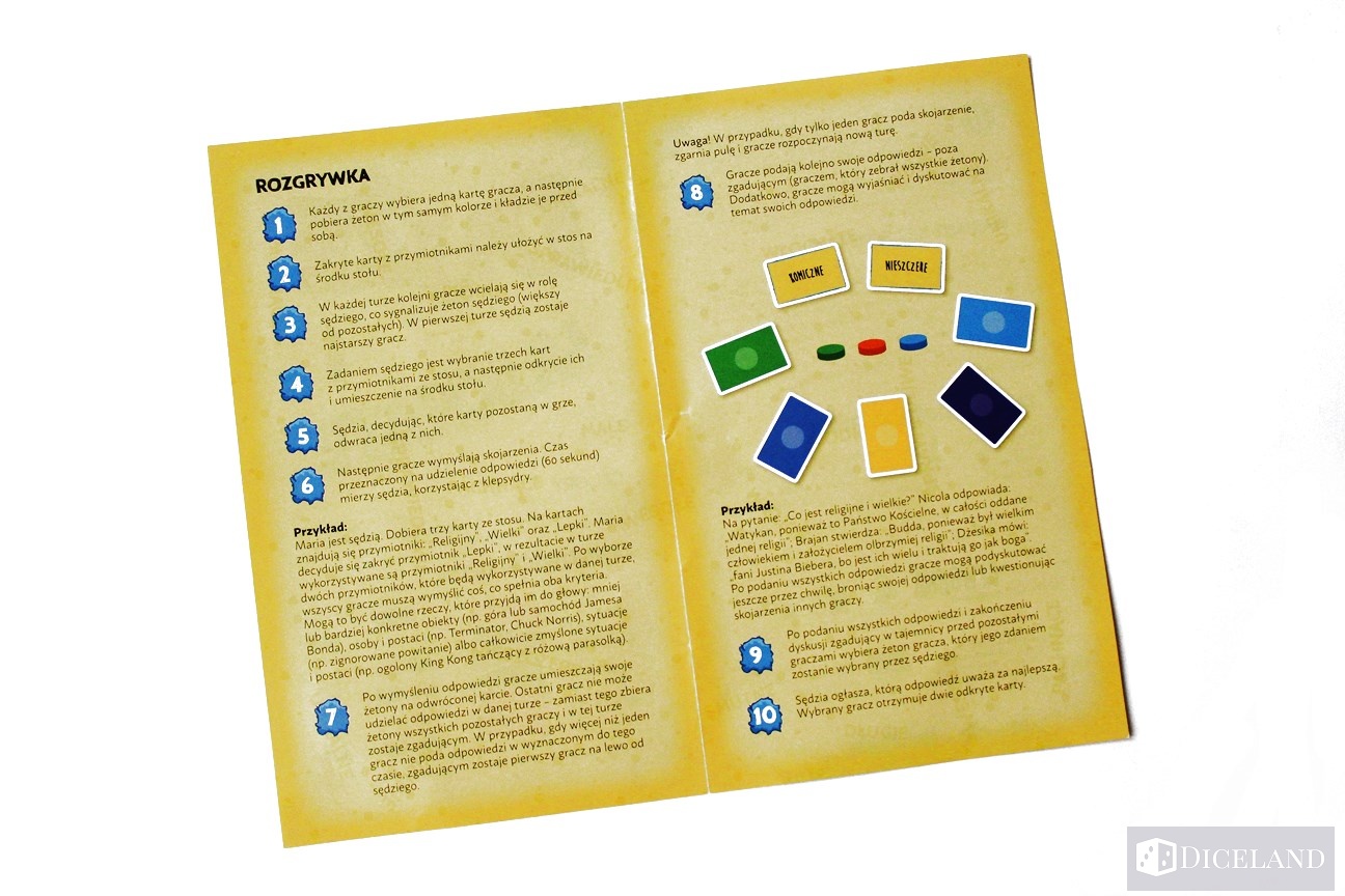 Gra przeznaczona jest dla dzieci od 8 lat, czas rozgrywki opiewa na 30 minut i grać można od 4 do 8 osób. W środku znajdziemy klepsydrę odmierzającą 60 sekund, które gracze mają na wymyślenie skojarzeń,