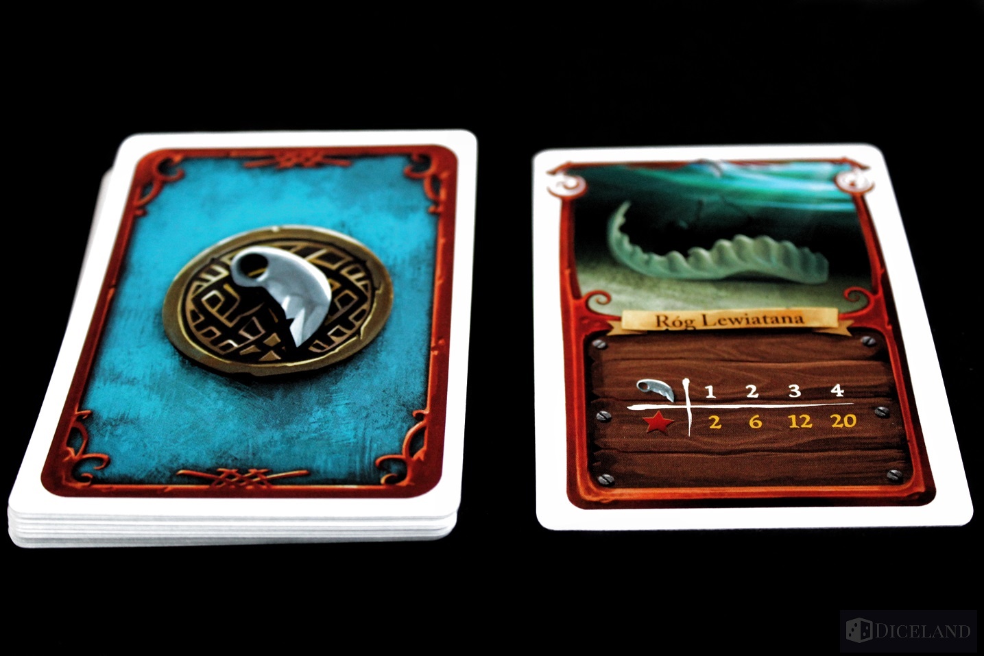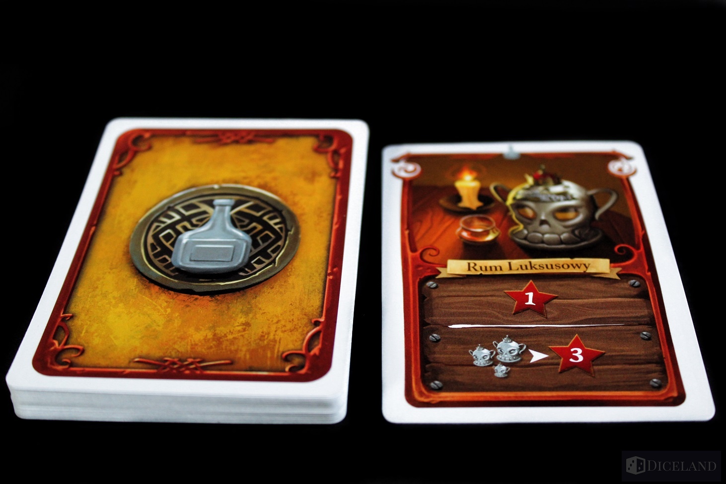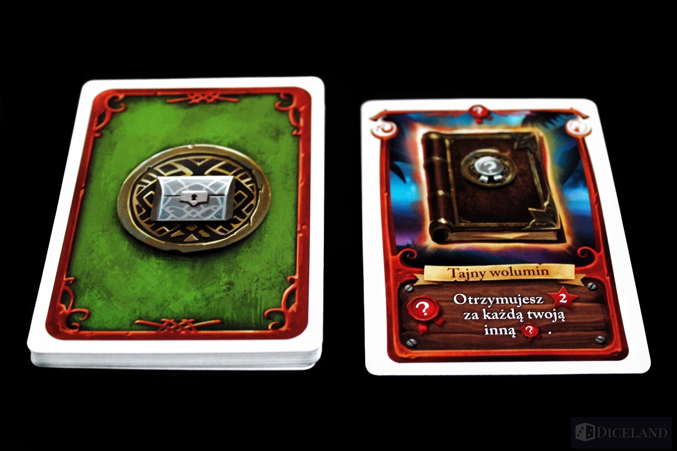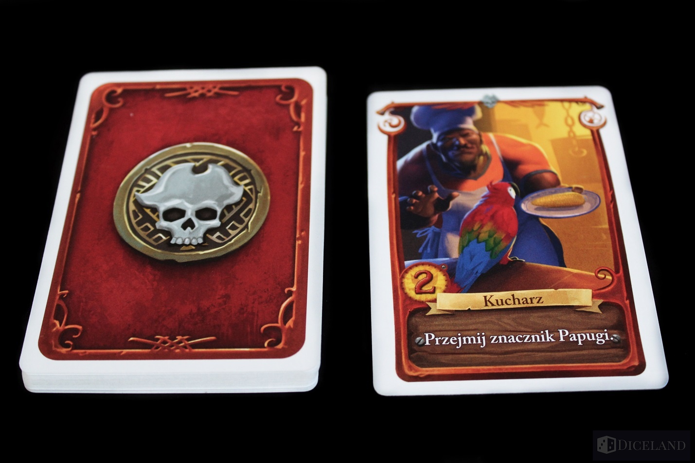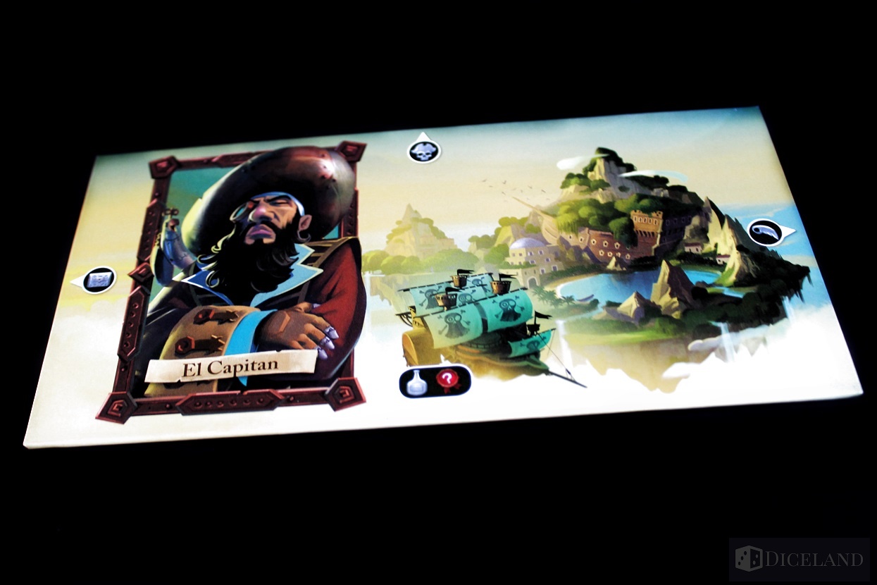 Wyjmiemy również niewielkich rozmiarów pole gry, które będzie nam przypominać na jakim etapie wyprawy jesteśmy. Po za walorami estetycznymi wszystkie plansze są wzorowo wykonane i na pewno wytrzymają próbę czasu. Kolejnym elementem będą liczne karty przedstawiające nasze łupy oraz członków załogi. Są one podzielone na kilka rodzajów: załogę, przedmioty, relikty i rum. Odróżnimy je dzięki odmiennym rewersom. Oprócz tego w pudełku znajdują się dwa drewniane znaczniki: statek i kapelusz, kartonowy znacznik papugi, bloczek z kartami punktacji oraz kartonowe dublony.