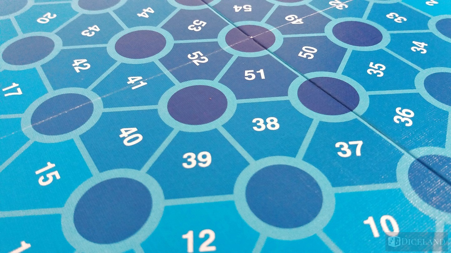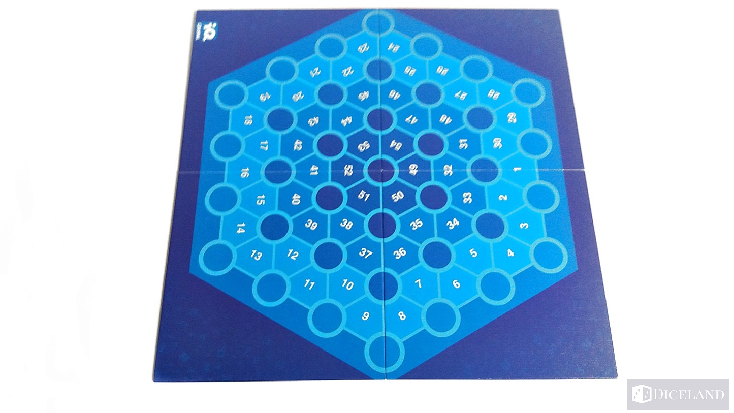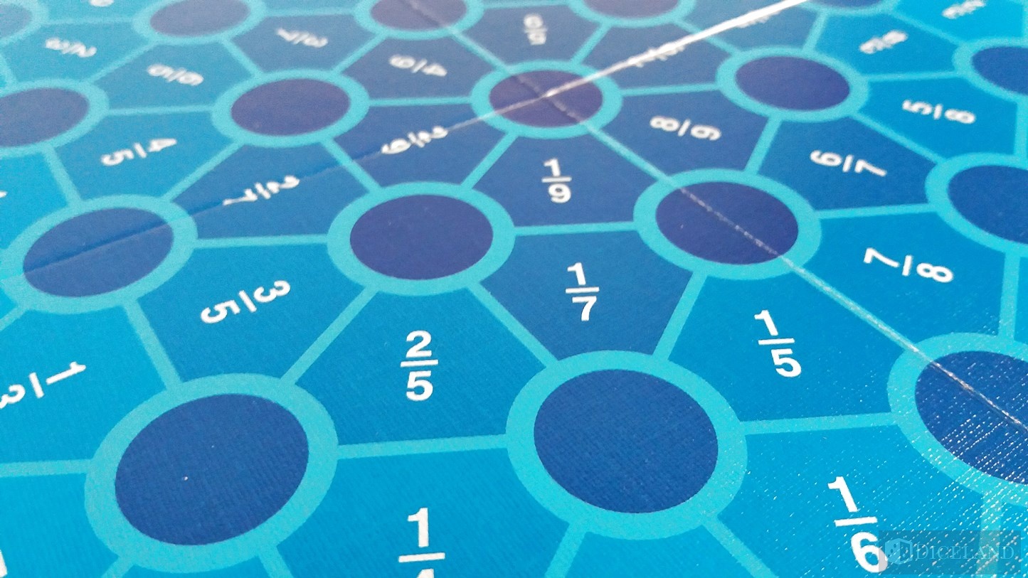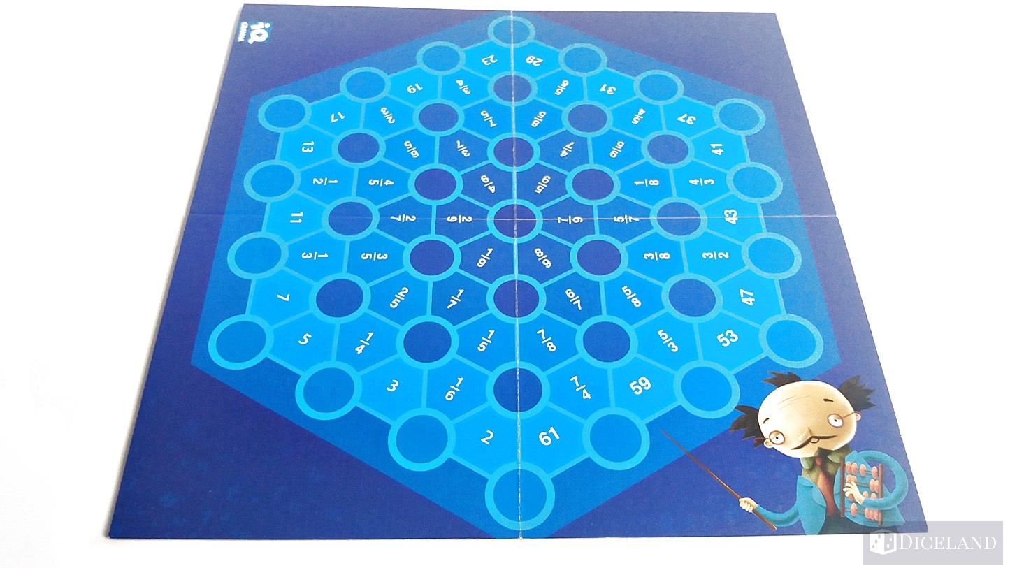 Kolejnym elementem jest główna plansza gry. Została ona wykonana bardzo solidnie i zarówno z jednej jak i drugiej strony przedstawia matematyczny hex. Po jednej (łatwiejszej stronie) znajdziemy liczby od 1 do 54, a po drugiej (znacznie trudniejszej) stronie, kilka liczb i ułamki. Każda liczba lub ułamek jest połączona z 3 okrągłymi polami, na których będziemy umieszczali nasze żetony.