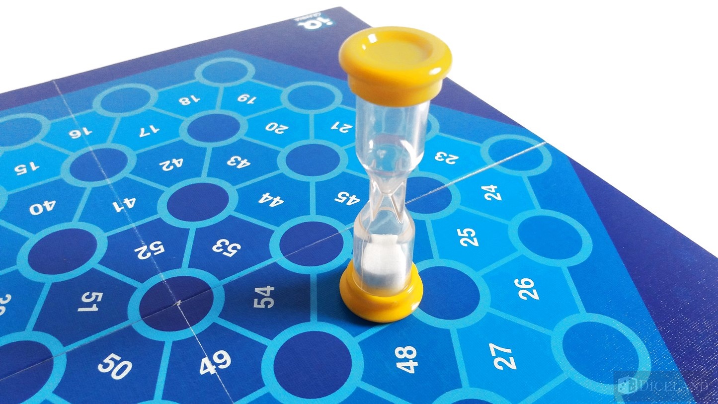 Oczywiście istnieje szereg innych kombinacji, ale to już pozostawiam wam. Pierwszy z graczy, któremu uda się wykonać działanie matematyczne, ogłasza swój wynik i jednocześnie umieszcza żeton w swoim kolorze na planszy znakiem zapytania na górze. Oczywiście pole, które zajmuje musi być niezajęte i sąsiadować z właśnie wyliczonym wynikiem. Z każdą liczbą stykają się zawsze 3 puste pola. W tym samym momencie jego zadaniem jest również odwrócenie klepsydry, która zacznie odliczać pozostałym graczom 15 sekund. Gracze nie mogą ogłaszać wyników, które padły w danej rundzie. Gdy tylko piasek w klepsydrze się przesypie, każdy gracz, któremu udało się podać wynik, musi teraz podać działanie matematyczne z którego on wynika. Jeśli wszystko się zgadza, wtedy żeton ze znakiem zapytania zostaje odwrócony, natomiast jeśli działanie było błędne zabiera swój żeton z planszy (trafia on z powrotem do puli gracza).