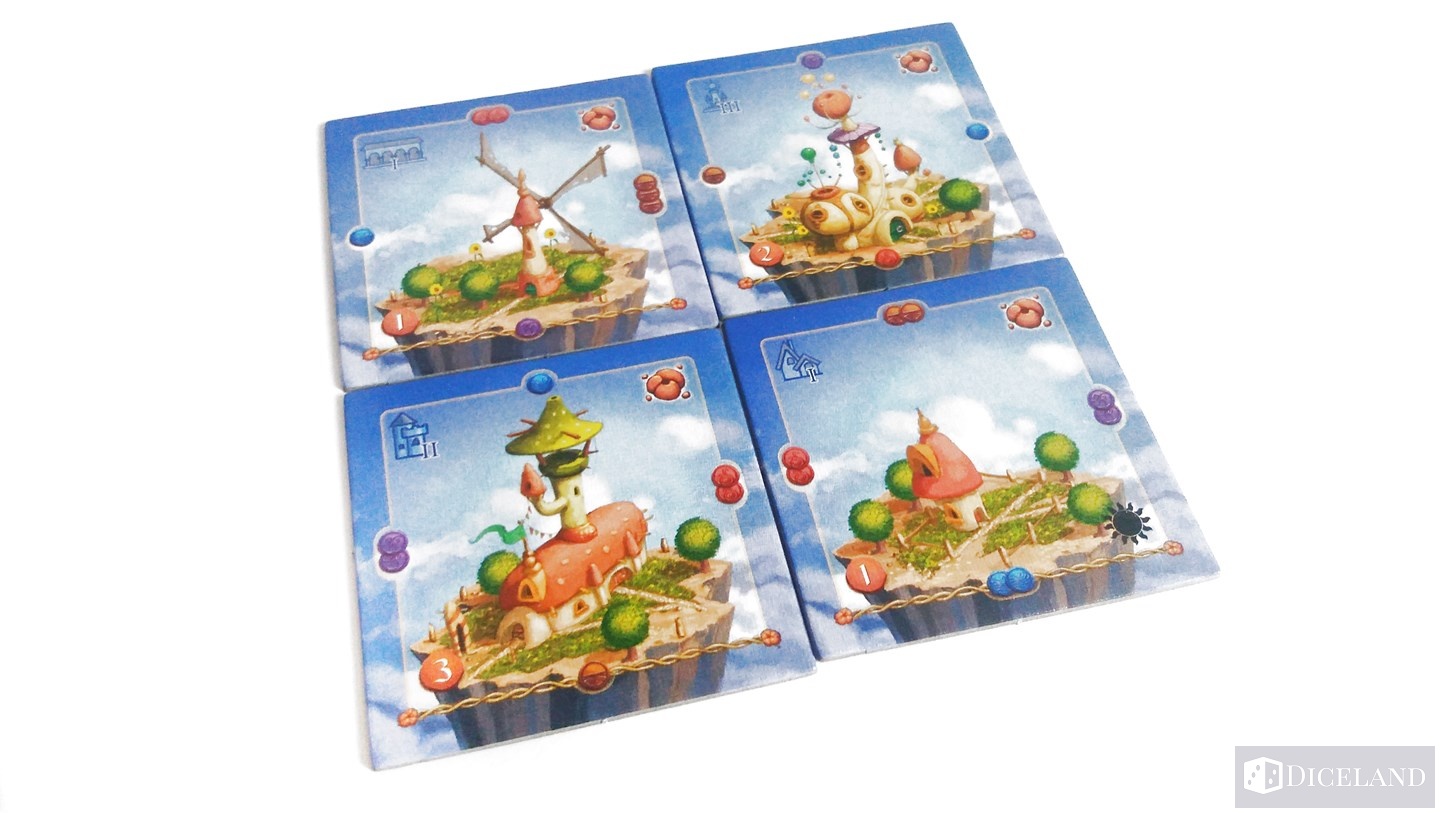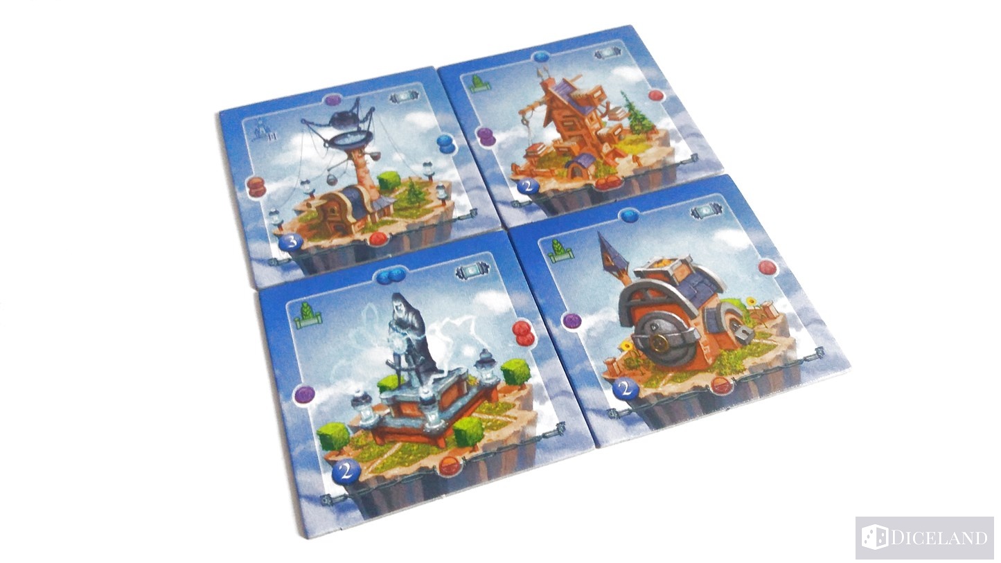Tuż pod instrukcją ukrywa się pozostała zawartość pudełka oraz świetnie skonstruowana tekturowa wypraska, w której swoje miejsce znalazły bardzo przyjemne w dotyku żetony gry. Przedstawiają one dwie frakcje: Inżynierów Światła oraz Rzeźbiarzy Natury. Na kafelku znajdziemy kawałek podniebnej wyspy wraz z budynkiem należącym do jednej z 5 kategorii: mieszkalne, produkcyjne, militarne, magiczne i specjalne. Do gry dołączony został także startowy kafelek Magicznego Zamku. Ilustracje na kafelkach są bardzo ładne, ale pomimo tego, że są to dwie odmienne frakcje i budynki nieco różnią się od siebie, to już od początku gry zauważamy pewien mankament, o którym za chwilę.