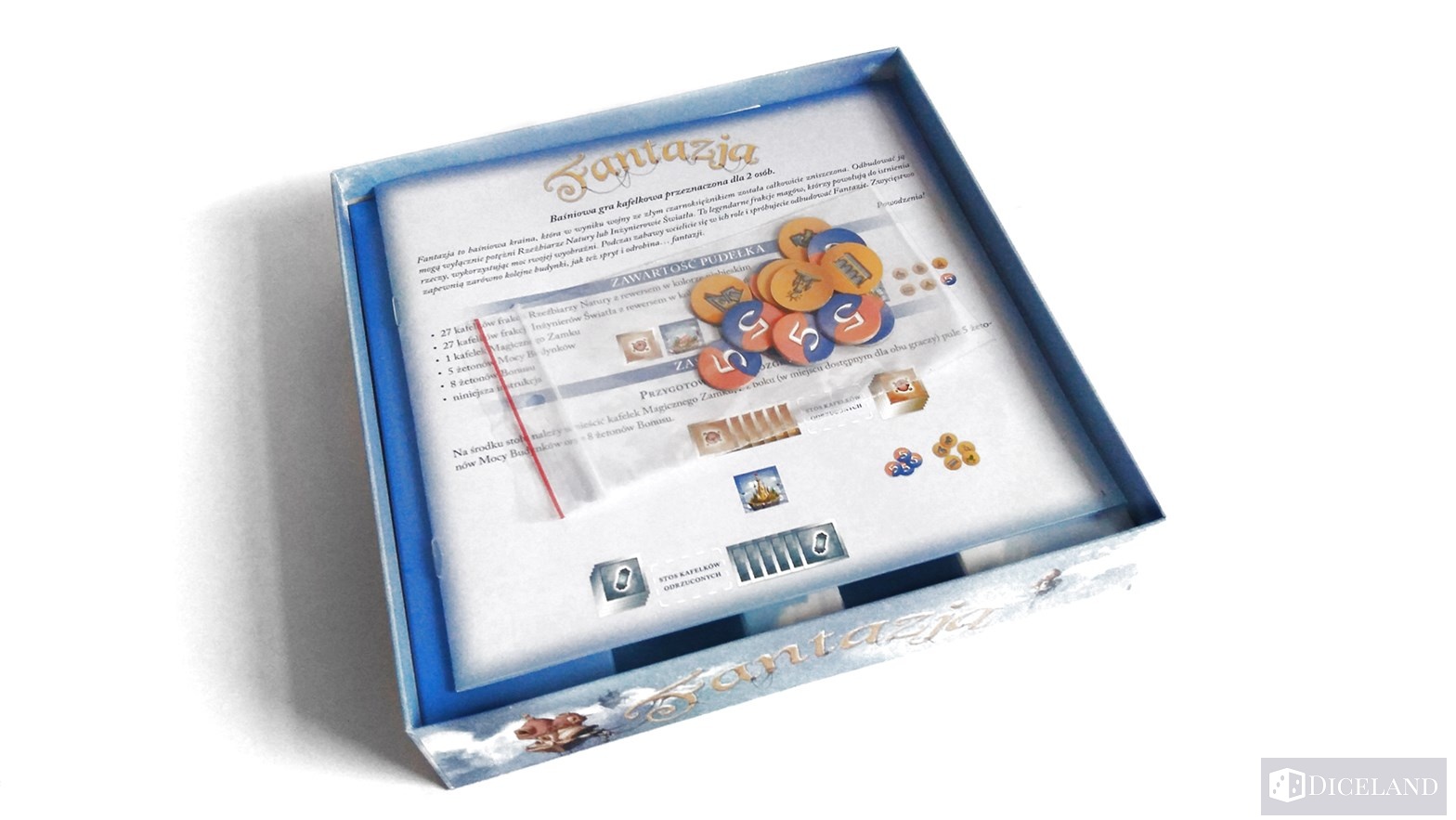 Fantazja to gra, której okładka już od pierwszego spojrzenia przyciąga uwagę. Jej magiczna aura sprawiła, że od razu zauroczyłem się tym tytułem. W środku pudełka jest również bajecznie. Kafelki są bardzo ładnie ilustrowane, do tego mamy bardzo dobrze napisaną instrukcję oraz świetną tekturową wkładkę, w której idealnie komponują się nasze kafelki dwóch frakcji i magicznego zamku. Zabrakło mi może dwóch kart pomocy z wyjaśnieniem działania mocy specjalnych. Najsłabszym elementem wykonania są żetony premii i mocy budynków. Są one wykonane z dość cienkiego kawałka tektury, ale nie przeszkadza to w żaden sposób w rozgrywce, dlatego uważam, że ich wykonanie jest tylko poprawne.