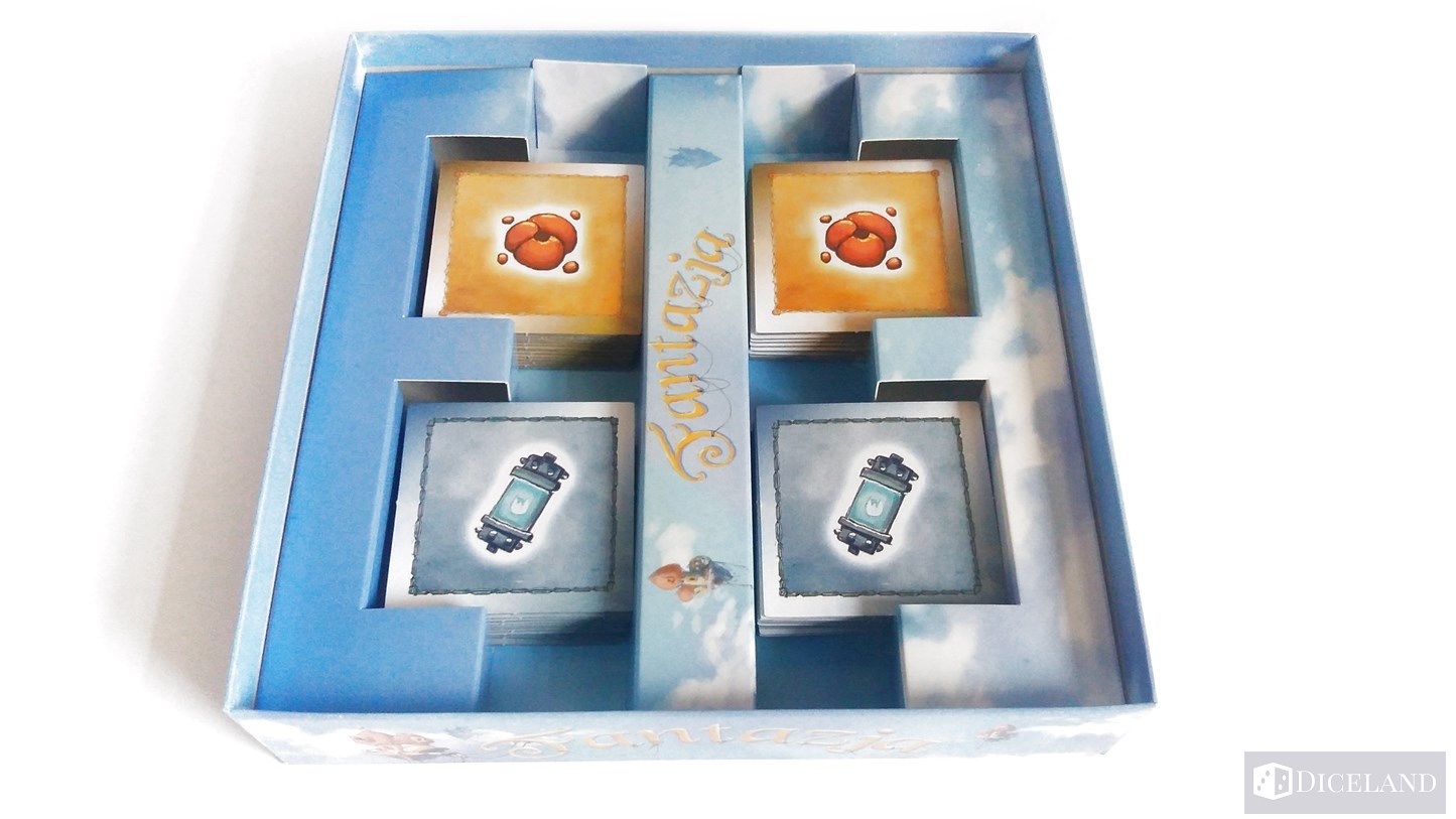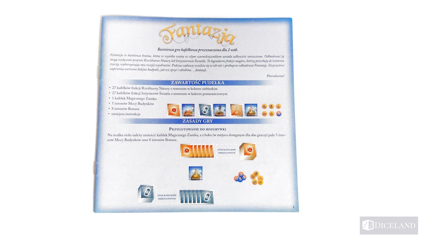 Zasady gry w Fantazję są całkiem proste. Zaczynamy od umieszczenia na środku stołu startowego kafelka Magicznego Zamku oraz w zasięgu graczy 8 żetonów bonusu i 5 żetonów Mocy Budynków. Teraz decydujemy, którą z frakcji chcemy grać (frakcje nie mają żadnych cech specjalnych, także ich wybór to tylko kwestia waloru estetycznego). Kafelki te należy odpowiednio przetasować i ułożyć z nich stos dobierania. Na naszą rękę trafia 6 kafelków, będziemy je trzymać w taki sposób, aby nie ujawniać ich naszemu przeciwnikowi.