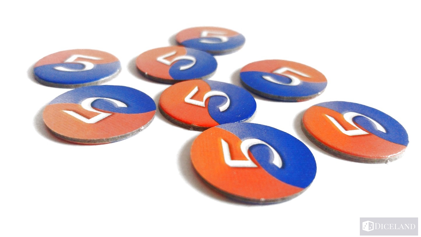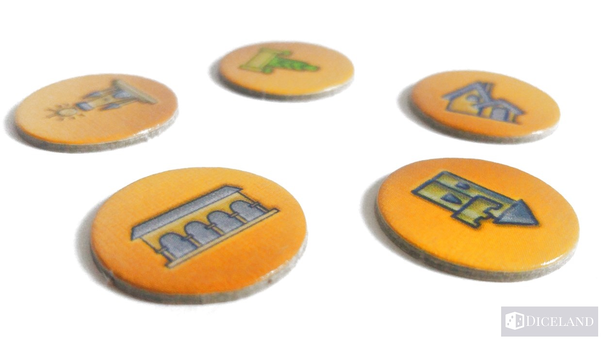 Ostatnimi elementami, które znajdziemy w pudełku jest 5 żetonów Mocy Budynków oraz 8 żetonów Bonus. Ich wykonanie uważam za poprawne.