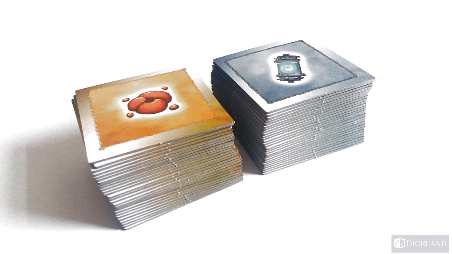 Drugim dość poważnym zarzutem jest typ budynku i jego poziom. Ilustracja ta jest niewielka, jest koloru niebieskiego i znajduje się, uwaga… na niebieskim tle. Dodatkowo mechanika umożliwia układanie kafelków na najróżniejsze sposoby. Jaki mamy tego efekt? Sałatka jarzynowa. Wpadłem na pomysł, aby frakcje odróżniać od siebie żetonami w dwóch różnych kolorach i gra od razu stała się przyjemniejsza, a przecież mogło to zostać rozwiązane już na etapie projektowania gry.