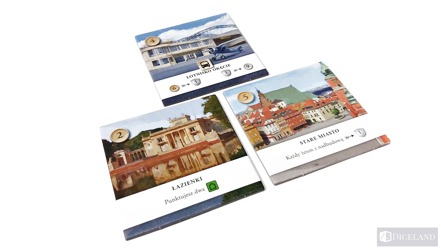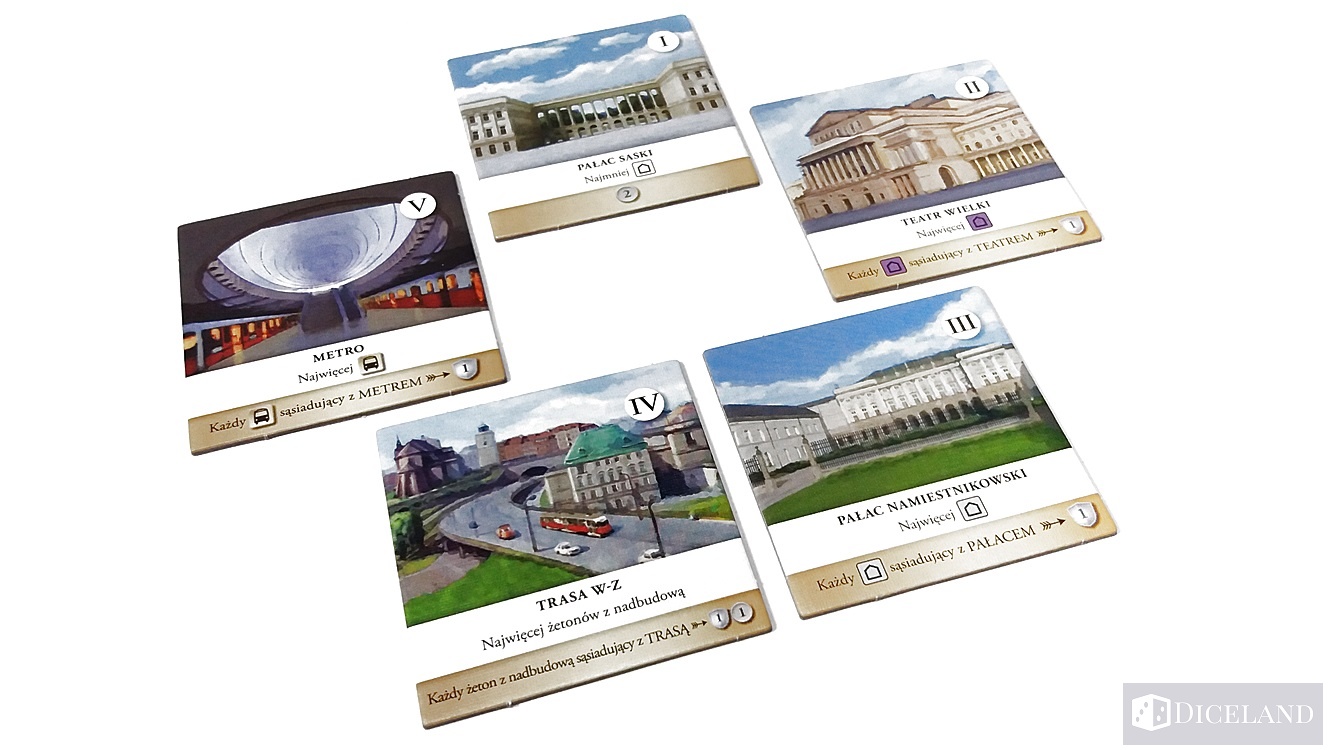 Ostatnim i chyba najważniejszym elementem gry są kafelki, z których będziemy budowali naszą wymarzoną dzielnicę. Ich główną zaletą jest ich stylistyka i związana z nią czytelność. Dzięki takiemu zabiegowi, bardzo szybko jesteśmy w stanie rozpoznać z jakimi obszarami mamy do czynienia. Kafelki dzielą się na sześć kolejnych epok, plus kafelki startowe po jednym dla każdego gracza. Dodatkowo znalazły się na nich malowidła prawdziwych budynków, które możemy spotkać w Warszawie. Kafle wydają się być trwałe i raczej nie powinny ulec szybkiemu uszkodzeniu. Dodatkowo na 3 płytkach znalazły się pomoce ułatwiające zrozumienie kilku symboli, a także zasady przypominające o punktacji w grze. W sumie otrzymujemy aż 108 żetonów.