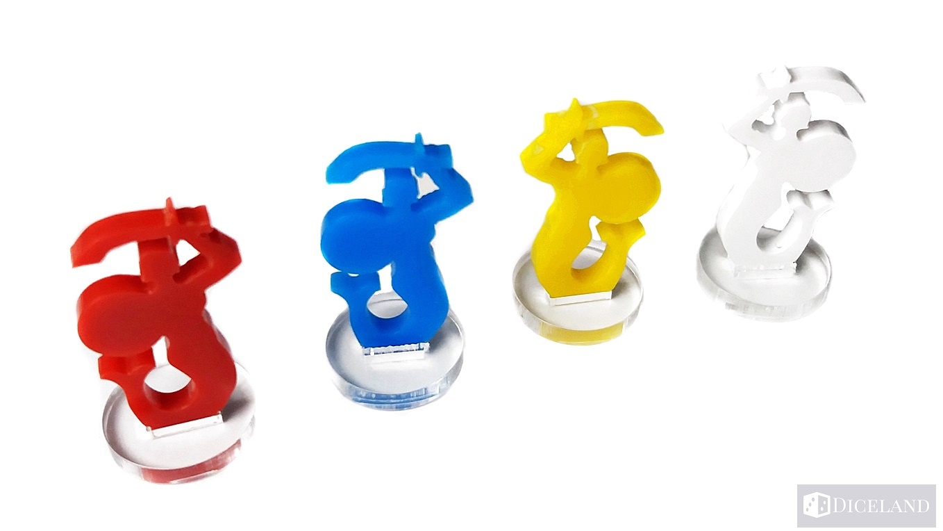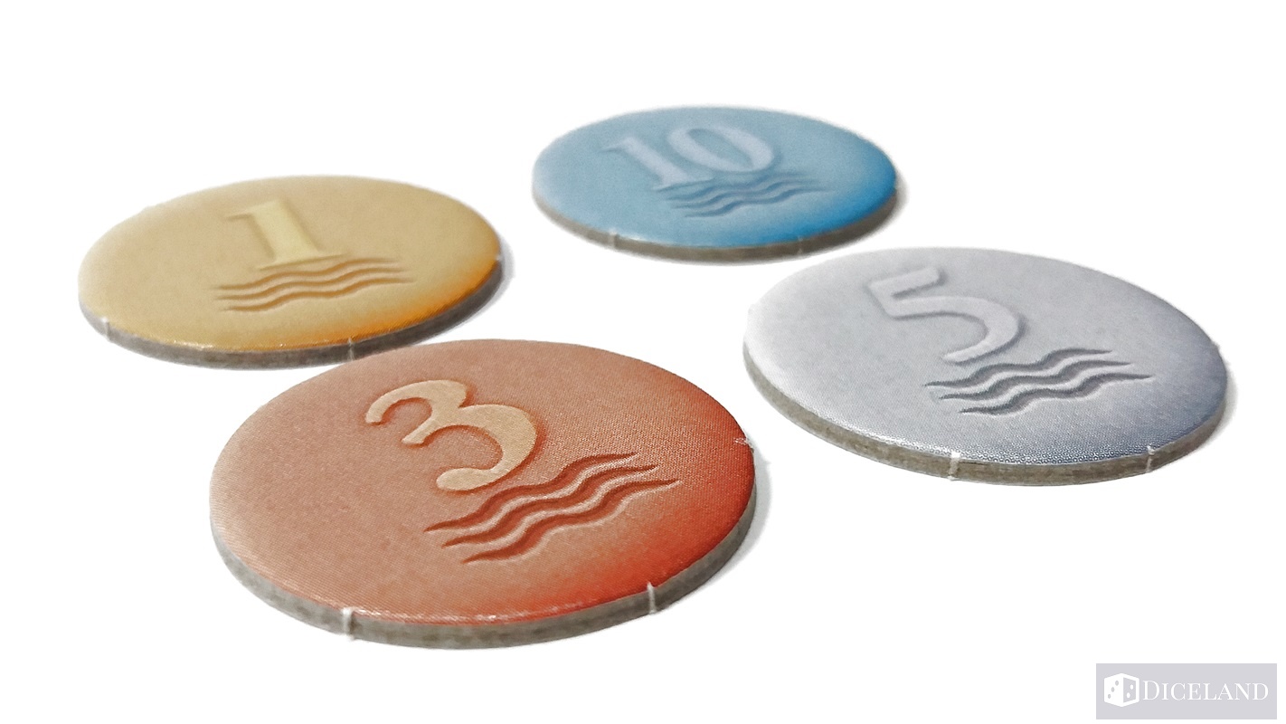 Do zaznaczania punktacji posłużą syrenki w czterech kolorach: białym, czerwonym, niebieskim i żółtym. Niestety już podczas wkładania ich do podstawek, tuż przed pierwszą rozgrywką, góra syrenki uległa uszkodzeniu. Dlatego też informuje was o tym, aby szczególnie uważać w tym właśnie momencie. Wynika to z faktu, że zostały one wykonane z wyjątkowo łamliwego plastiku i niestety jest to ich wadą. Bardzo dobrze prezentują się żetony monet w czterech nominałach: 1, 3, 5 i 10. Są one łatwe do odróżnienia od siebie i doskonale wpisują się w ogólną stylistykę gry. Jest ich w sumie 36.