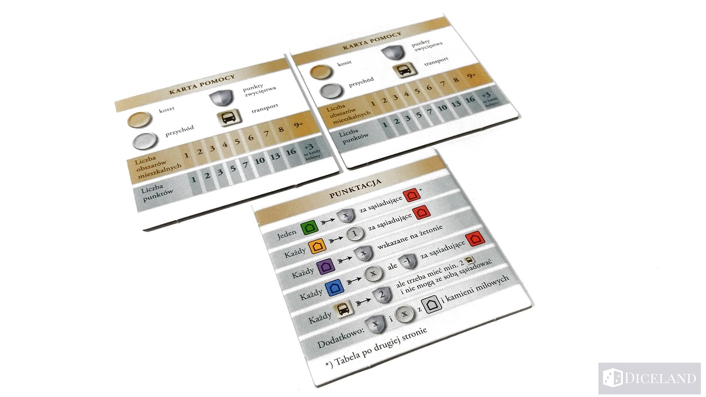 - Obszary mieszkalne sąsiadujące z jednym wybranym przez nas parkiem (im więcej obszarów sąsiadujących, tym więcej punktów). Specjalna tabelka na karcie pomocy, podpowie nam ile punktów możemy zyskać.