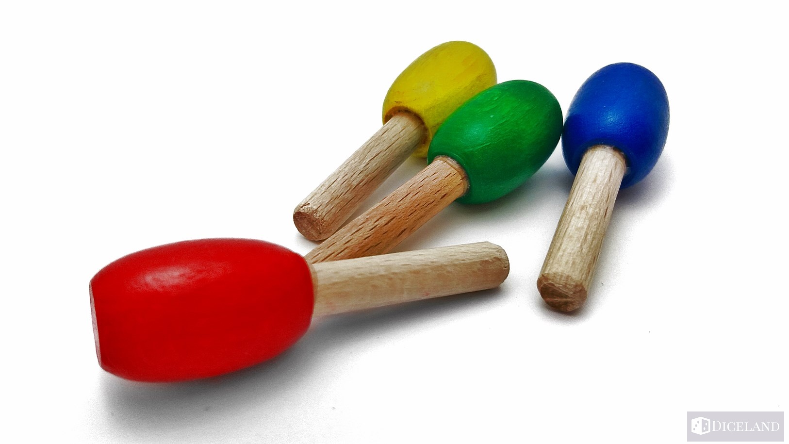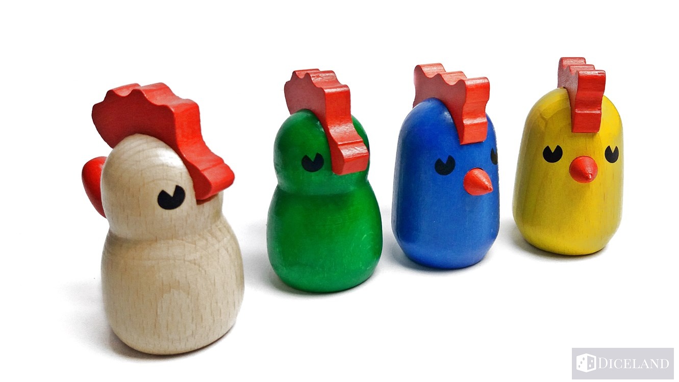 Jak sami widzicie dużą część stanowi tekturowa wkładką, którą wypełnia powietrze, dlatego też pudełko powinno być wyraźnie mniejsze. Pierwszymi elementami, które rzucają nam się w oczy to ogromne drewniane figurki kurczaków w czterech kolorach: żółtym, białym, niebieski oraz zielonym. Do figurek dołączone zostały drewniane piórka, specjalnie dopasowane by umieścić je z tyłu naszego kurczaczka.