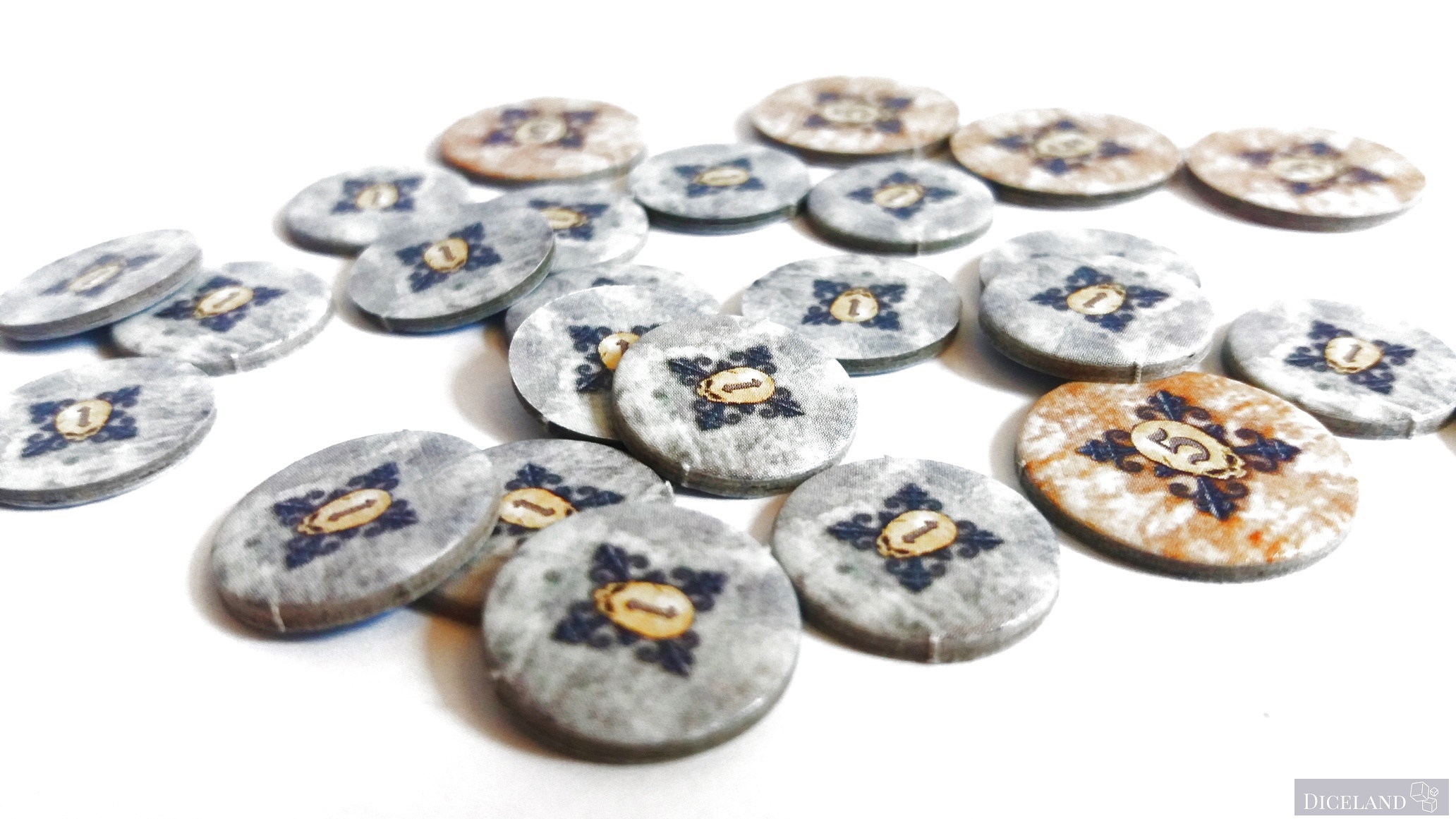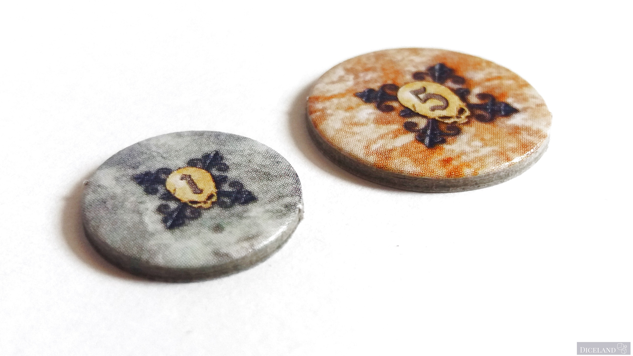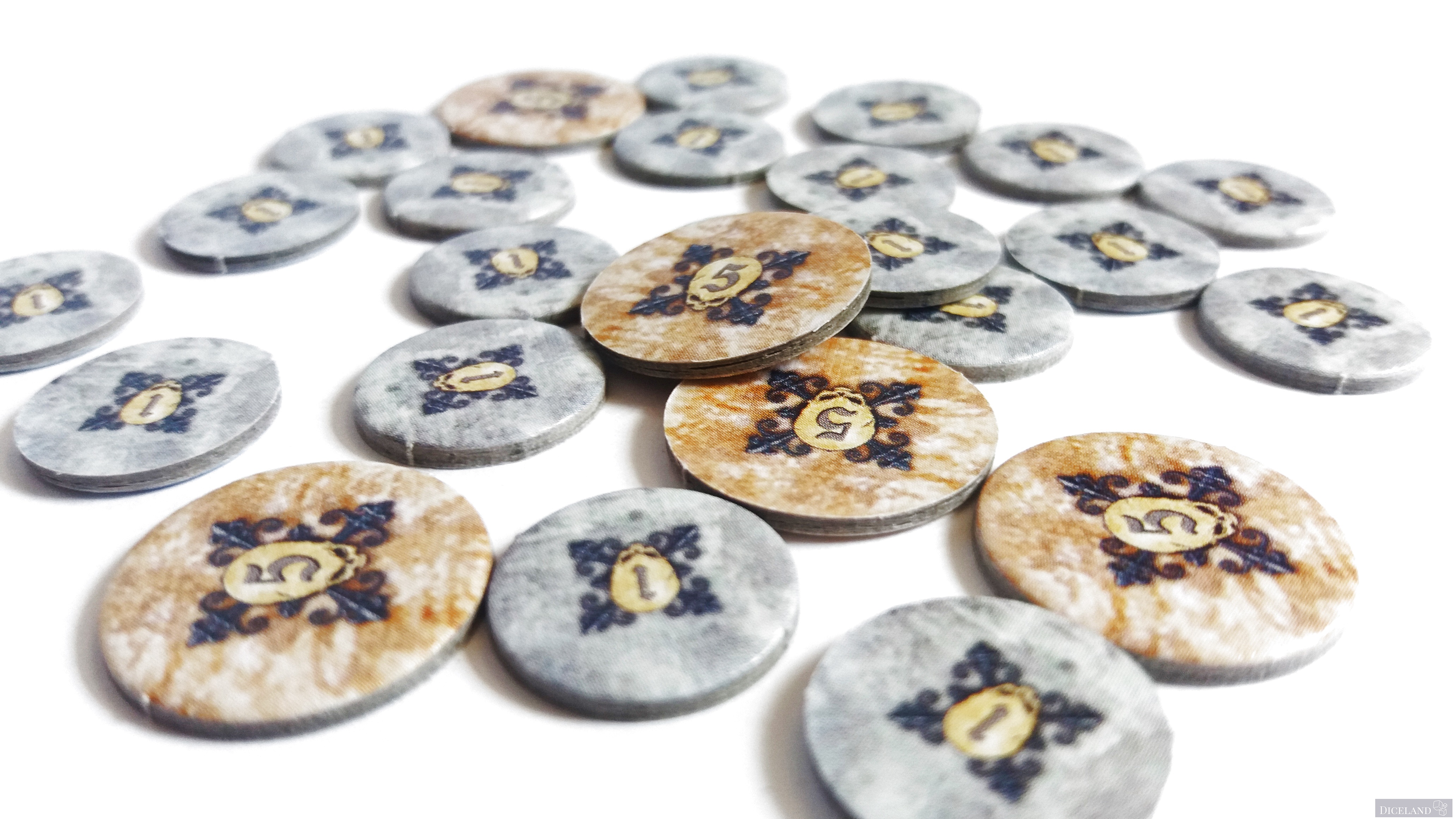 W pudełku znajdziemy również 25 żetonów punktów zwycięstwa o dwóch wartościach 1 PZ i 5 PZ. Żetony te są wykonane solidnie, ale mogłyby być odrobinę większe.