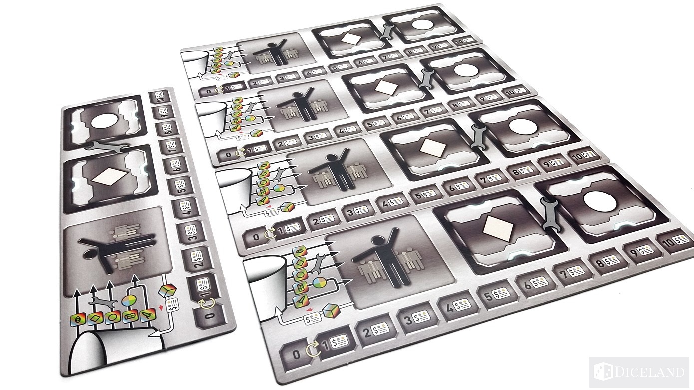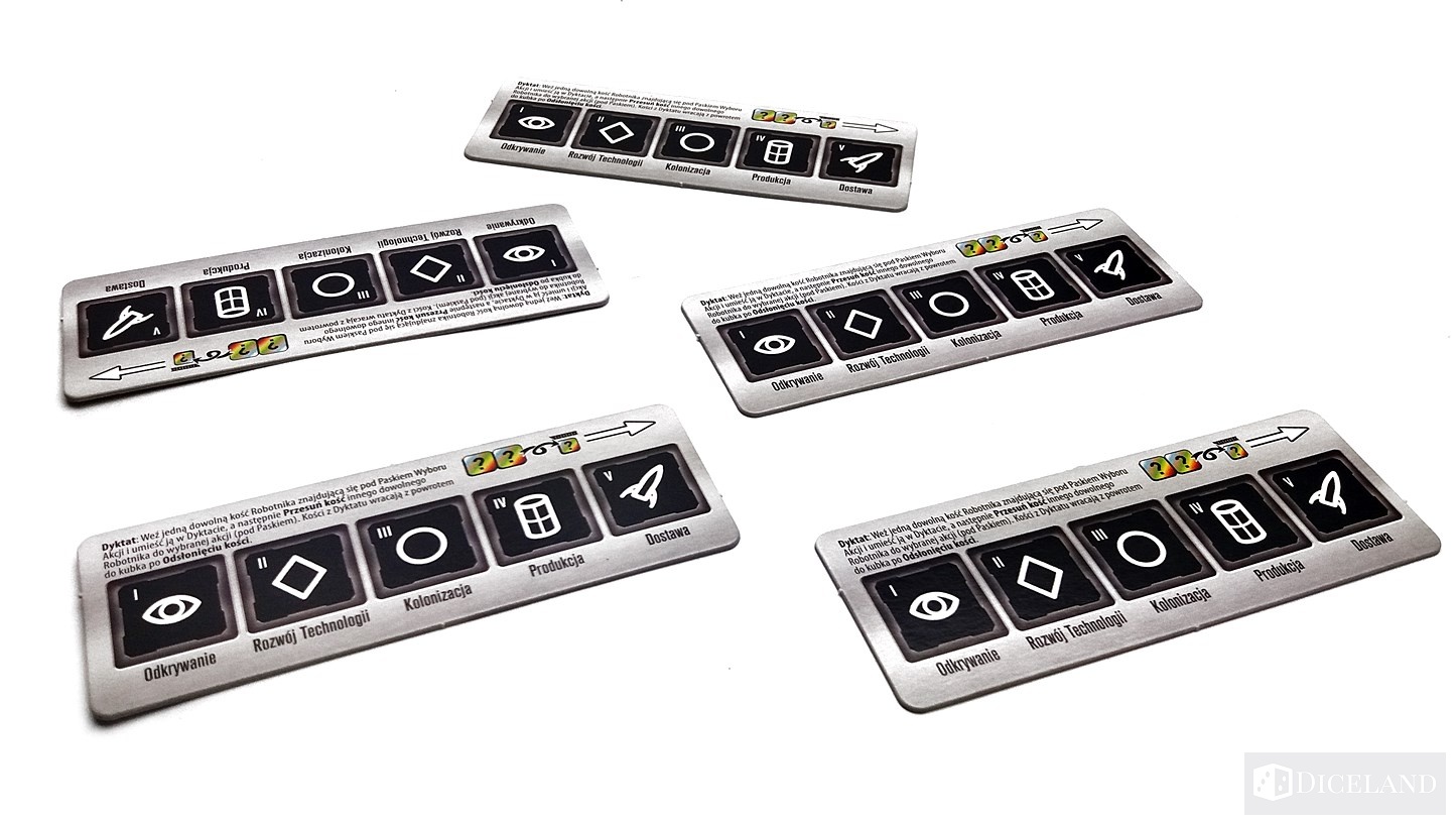 Dla każdego gracza został przygotowany pasek wyboru akcji, który umieścimy za naszą zasłonką, jak również po 1 planszy gracza. Będziemy na niej przetrzymywali kości populacji, zaznaczali liczbę posiadanych kredytów galaktycznych, a także przechowywali kafelki z technologiami i planetami, które możemy zbadać. Zostały one wykonane z cieńszej tektury, niż wcześniej omawiane kafle i są bardziej podatne na uszkodzenia.