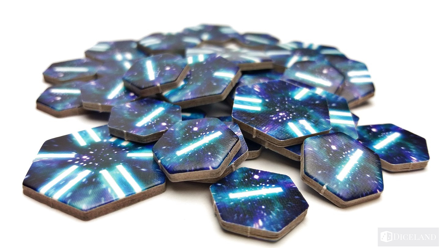 Kolejnym komponentem są kafle frakcyjne, które otrzymamy na start wraz z losowo wybraną rodzimą planetą (zarówno kafli frakcyjnych jaki i rodzimych planet jest po 9 sztuk). Wyróżniają je ciemnoszare rogi. Poza kafelkami startowymi w pudełku znalazło się również miejsce na 55 kafli, które posłużą nam do rozbudowy naszego imperium. Są one wykonane z solidnego kawałka grubej tektury i raczej ciężko o ich zniszczenie. Chociaż podczas kilku testowych rozgrywek, znalazł się jeden taki, którego wierzchnia powłoka lekko się odkleiła. Mam nadzieję, że podklejenie go rozwiąże ten problem.