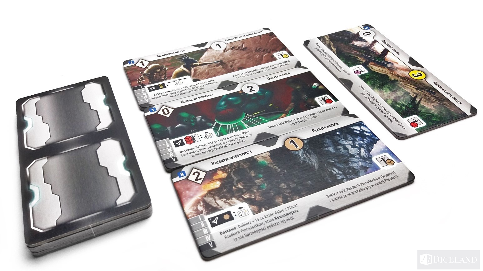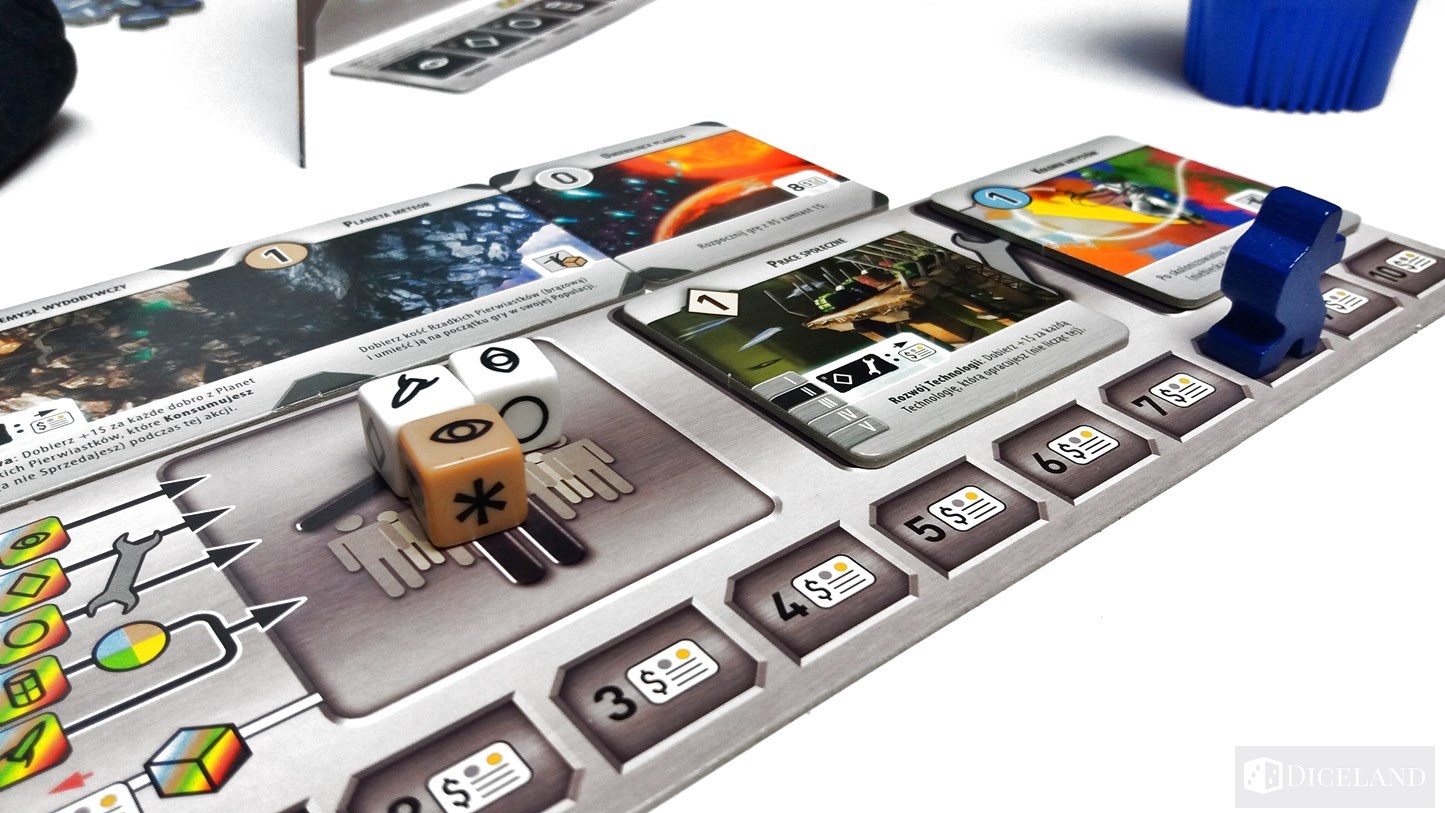 Podczas wykonywania akcji odkrywania, będziemy pozyskiwali z woreczka nowe kafelki lub po prostu pozyskamy więcej Kredytów Galaktycznych. Rozwój pozwoli nam na badanie wcześniej wylosowanych kafelków technologii. Będziemy na nich umieszczali kolejnych pracowników, aż w końcu uda nam się odkryć coś nowego, co stanie się nieodłączną częścią naszego galaktycznego imperium. Akcja kolonizacji pozwoli nam badać planety, które wcześniej trafiły z woreczka na planszę gracza. Z każdej nowo odkrytej planety pozyskamy nowe kosteczki, niektóre w formie wyprodukowanych dóbr, a inne w postaci robotników, których umieścimy w kubeczku lub na planszy gracza w miejscu populacji. Produkcja pozwoli nam jak sama nazwa wskazuje na wyprodukowanie najróżniejszych dóbr na planetach, które są pod naszą jurysdykcją.
