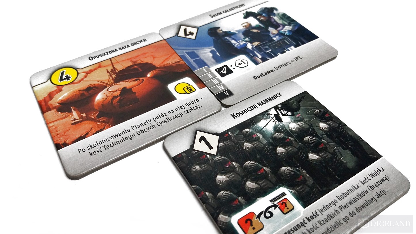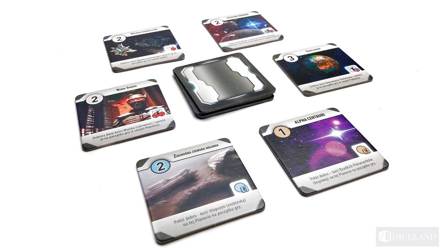 Jeszcze przed rozpoczęciem rozgrywki, trafią do nas dwa losowe kafelki, które wcześniej wyciągniemy z materiałowego woreczka. Musimy się zdecydować na jedną za stron, pamiętając, że jeden z nich musi przedstawiać technologię, a drugi planetę. Pozostało nam tylko ustalić nasz początkowy budżet, który zazwyczaj wynosi 1 kredyt galaktyczny (tak została nazwana waluta w grze).