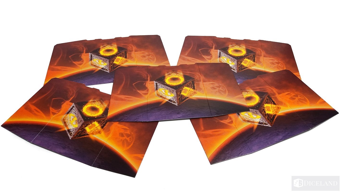 Wszystkie zasady zostały również umieszczone na 5 zasłonkach (po jednej dla każdego gracza). Posłużą one do przeprowadzania w ukryciu przed naszymi towarzyszami jednej z faz gry. Na jej zewnętrznej stronie znajdziemy ilustrację, którą mogliśmy już zobaczyć na okładce pudełka, natomiast jej wewnętrzna część to wcześniej wspomniane zasady. To na co warto szczególnie zwrócić uwagę, to fakt, że została tam umieszczona duża liczba najróżniejszych symboli. Na pierwszy rzut oka nic one nie mówią niedoświadczonym graczom, a to właśnie dla nich takie pomoce powinny być przeznaczone.