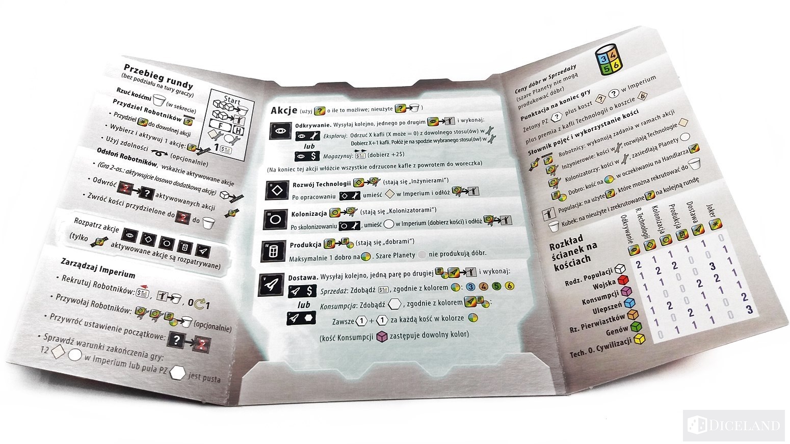 Po otworzeniu pudełka ujrzymy dużą liczbę komponentów, które posłużą nam podczas rozgrywki w „Roll for the Galaxy”. Znajdziemy tam między innymi instrukcję, która wymaga od nas dość dużego skupienia podczas lektury. Zasady nie są tak trudne jak mi się początkowo wydawało, aczkolwiek gra zawiera kilka pomniejszych reguł, o których należy pamiętać podczas rozgrywki. Na początku nie wszystko wydaje się być intuicyjne. Zasady zostały uwiecznione na 12 jej stronach, a użyto do tego małej czcionki, co początkowo może odrzucać, ale na szczęście duża liczba przykładów z rozgrywki bardzo ułatwia nam zrozumienie gry.