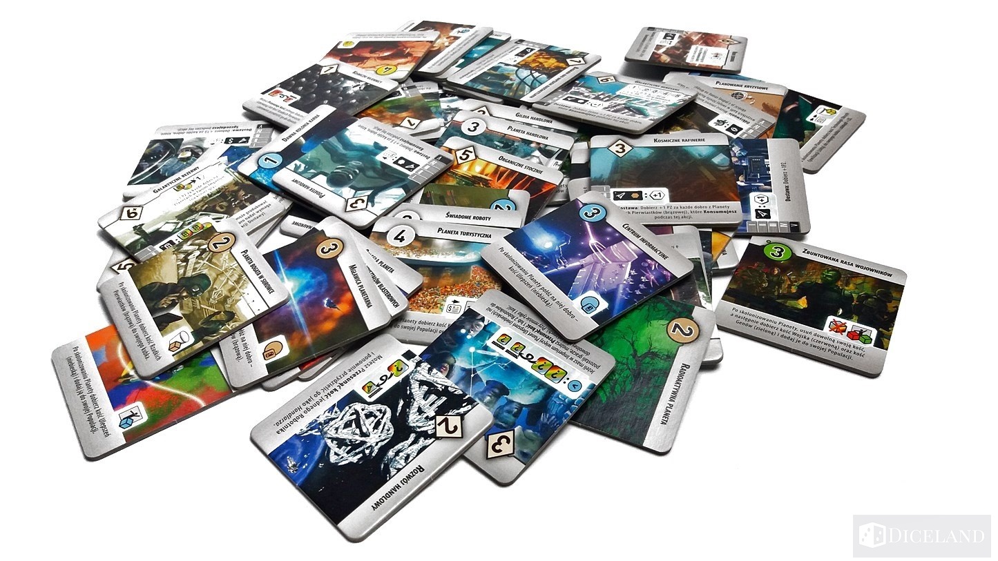 Grafiki na kafelkach są bardzo ładnie ilustrowane i przede wszystkim różnorodne. Naprawdę widać na nich, że zwiedzamy najróżniejsze zakątki kosmosu. Warto tutaj zwrócić uwagę, iż kafelki służące do rozbudowy naszego imperium są dwustronne i zawsze zawierają po jednej stronie planetę, a po drugiej technologię.