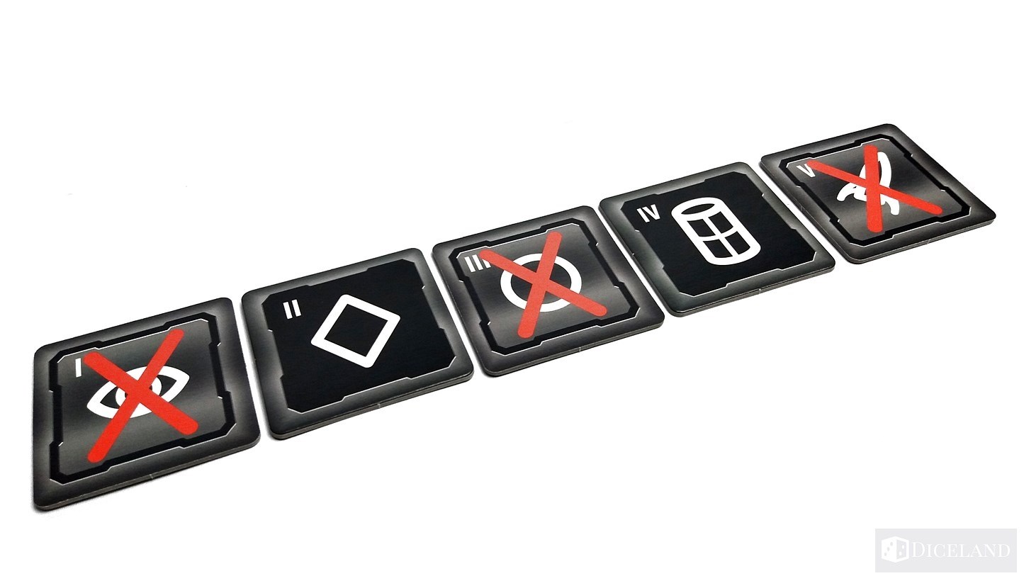 Otrzymujemy także materiałowy woreczek, do którego wrzucimy kafelki. Posłuży on do losowania kolejnych żetonów podczas akcji odkrywania. 5 specjalnych żetonów, które umieścimy na środku stołu, będzie wskazywać graczom aktualnie dostępne możliwości. Po obu ich stronach widzimy symbole danych akcji, jednak na jednej z nich symbol ten jest przekreślony i oznacza, że dana akcja nie będzie w tej turze wykonywana.