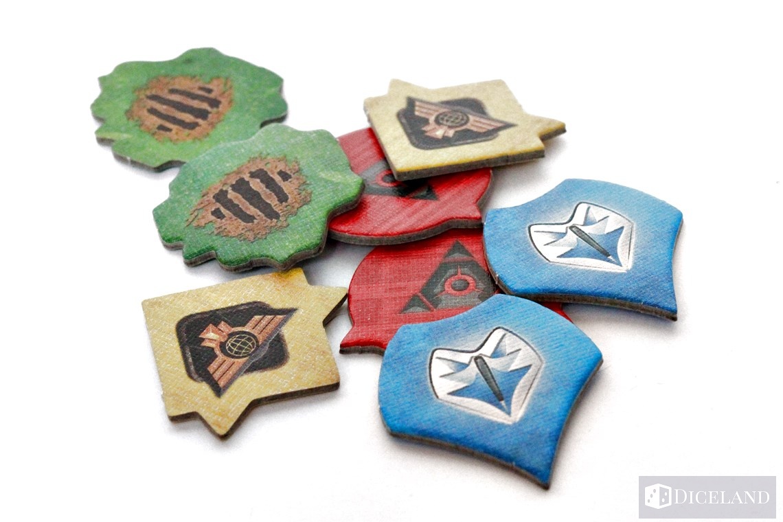 Opisywanie plastikowych elementów rozpocznę od kryształów, czyli przyczyny konfliktu na nowo odkrytej planecie. Są one wykonane w 3 kolorach, a każdy z nich odpowiada innej liczbie. Zielone oznaczają 1, żółte 3, a czerwone 5 kryształów. Jest to całkiem elegancki komponent gry, ładnie komponujący się z całością.