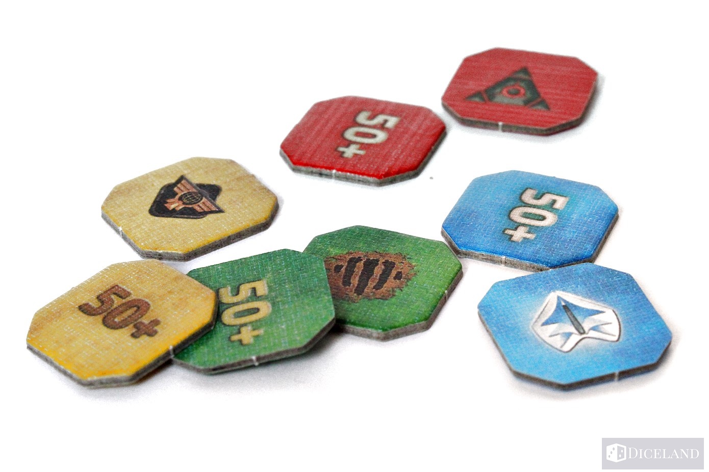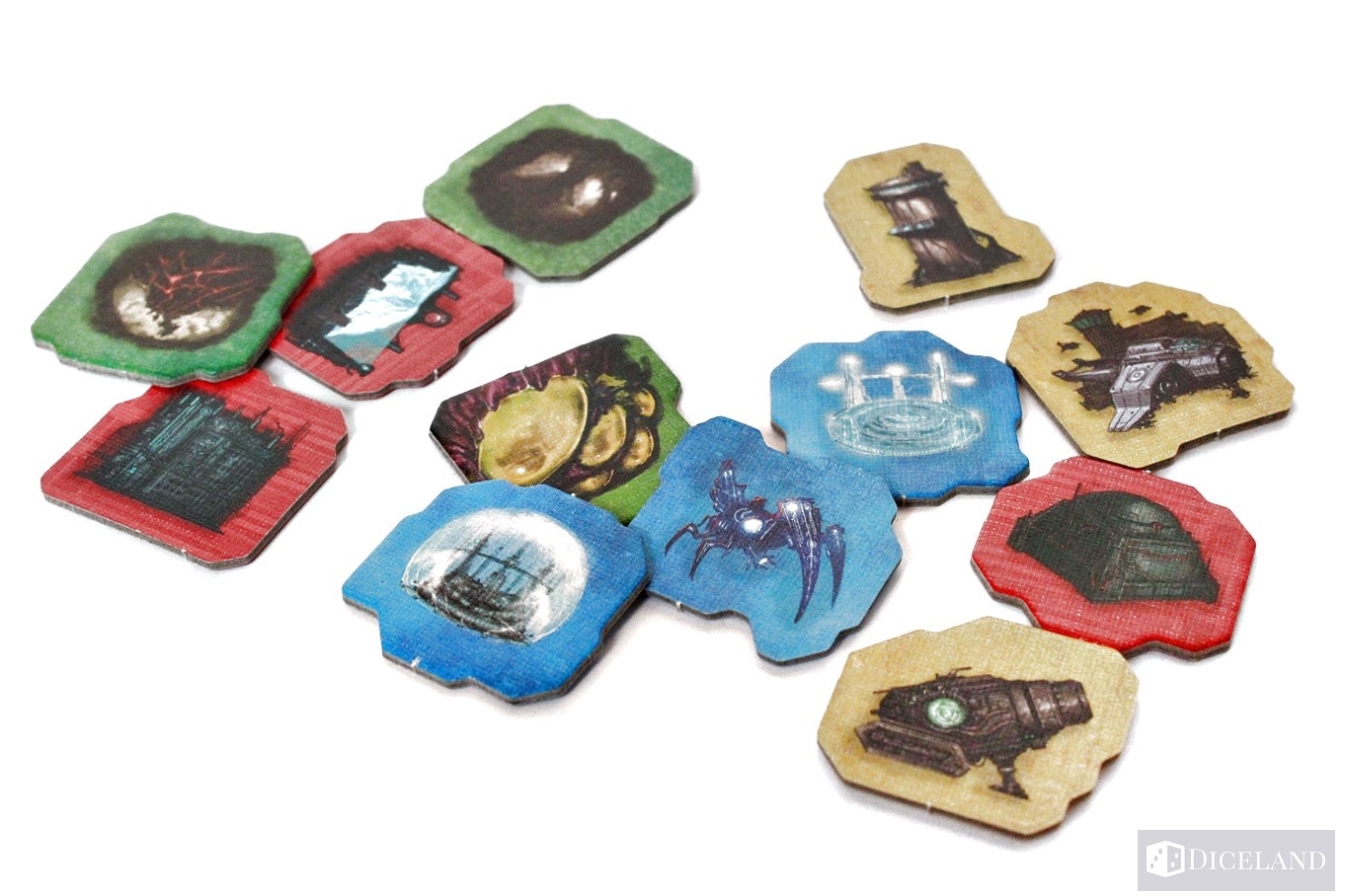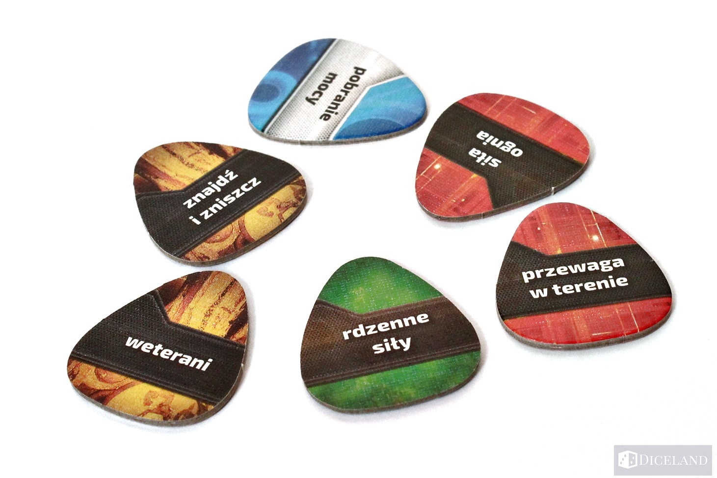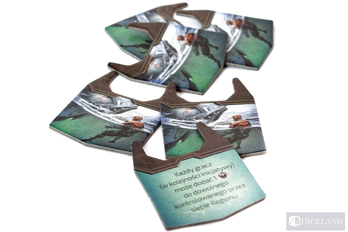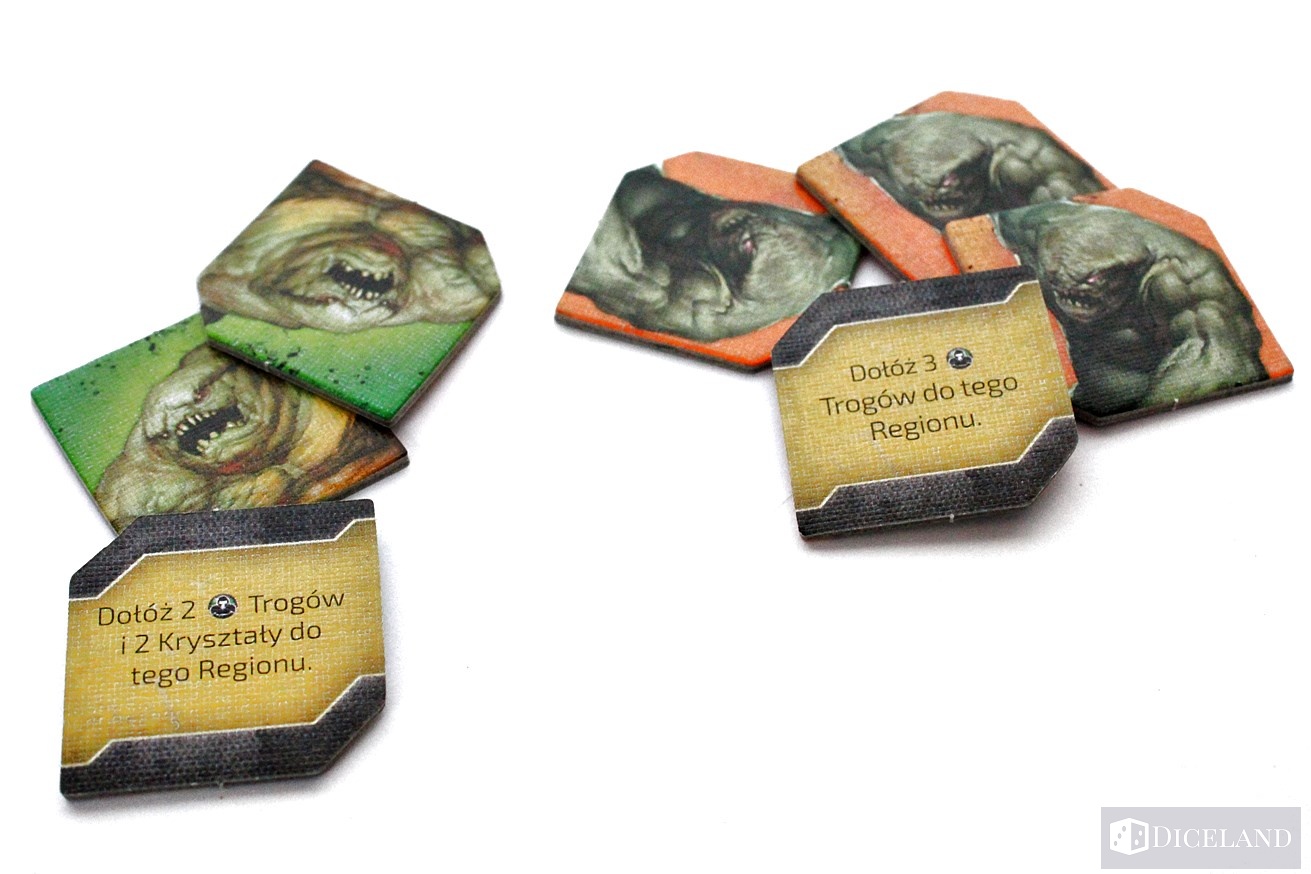 Wraz z grą otrzymamy także wiele rodzajów żetonów. Wśród nich znajdziemy takie, które wykorzystywane będą przez jedną z ras (będziemy nimi m.in. oznaczać kontrolę nad regionem, czy określać w której prowincji wybudowaliśmy budynek) oraz będące ogólnymi elementami gry, jak na przykład żetony hord i siedlisk trogów, czy żetony eksploracji (dające bonus pierwszemu graczowi wchodzącemu na konkretne pole). Wykonanie ponownie wzorowe.