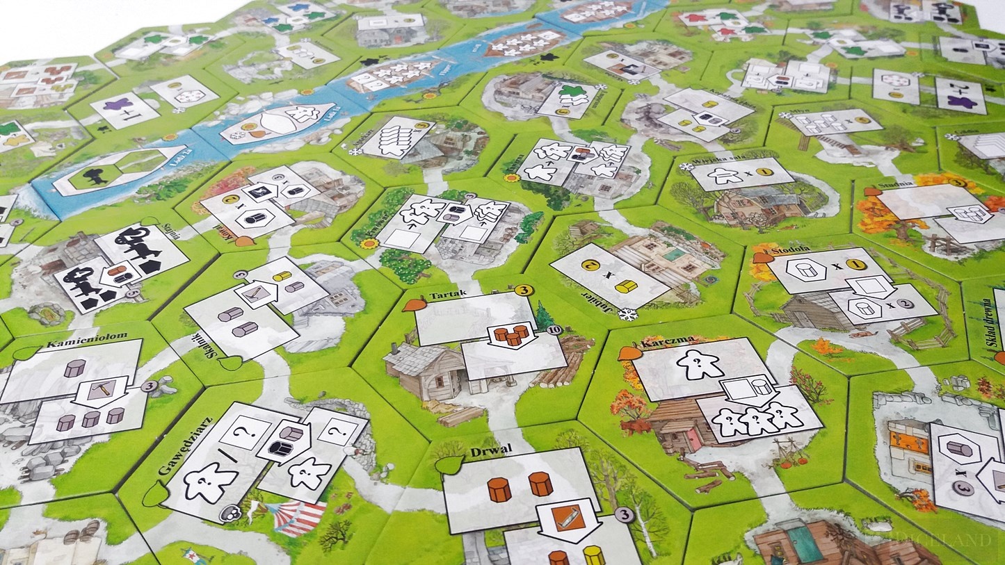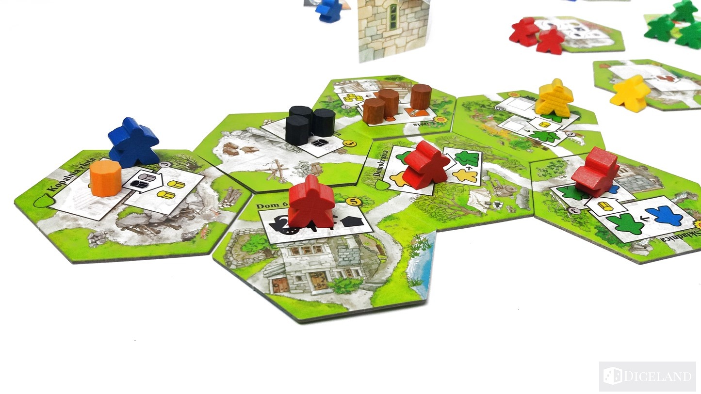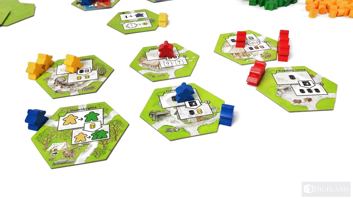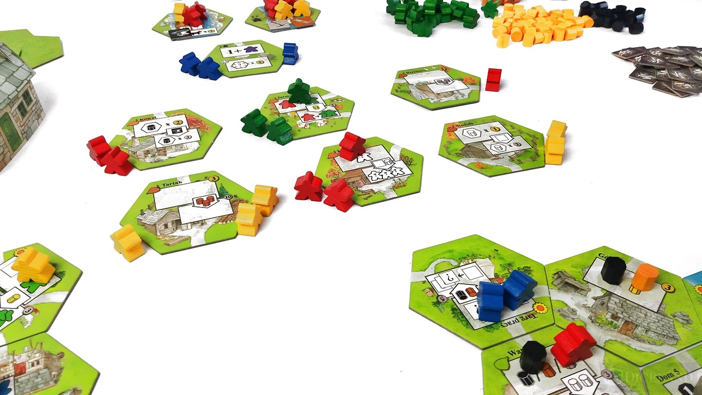 Możemy również użyć budynku na kaflu znajdującym się na środku stołu bez jego licytacji. Jeśli nie wygramy w danej rundzie tego kafla, to robotnik wraca albo do worka, albo do gracza, który ową licytację wygrał. To samo dzieje się, jeśli wyślemy naszego robotnika w ramach handlu do wioski naszego przeciwnika. Zyskujemy i tracimy, to cała prawda o handlu! Jednakże używając danego kafla należy pamiętać, że na jednej płytce można stawiać pionki tylko w jednym kolorze i nie może ich być więcej niż 6. Dzięki temu możemy wpływać na innych graczy blokując ich kafle i niwecząc im plany.