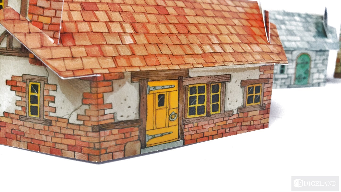 Pudełko gry Keyflower może zaskoczyć nas swoim ciężarem, ponieważ w środku znajdują się płytki terenów, żetony narzędzi, drewniane surowce oraz coraz częściej wykorzystywane w różnych grach typu worker placement pionki nazywane „meeplami”. Każdy z wymienionych elementów wykonany został bardzo solidnie, a ilustracje na płytkach terenów wprowadzają nas w klimat średniowiecznej wioski. Do gry dołączono również zasłonki (parawany), przedstawiające nasze domostwo, które niestety odbiegają jakością od reszty elementów. Wykonane zostały z dość cienkiej tektury, przez co mogą odginać się w trakcie składania. Dodatkowo podczas próby zamontowania kominów na dachach, jesteśmy w stanie porządnie je uszkodzić. Oczywiście po złożeniu domków nie ma konieczności ponownego ich rozkładania, ponieważ mieszczą się w pudełku. Dzięki temu jesteśmy w stanie zniwelować dalsze szkody.
