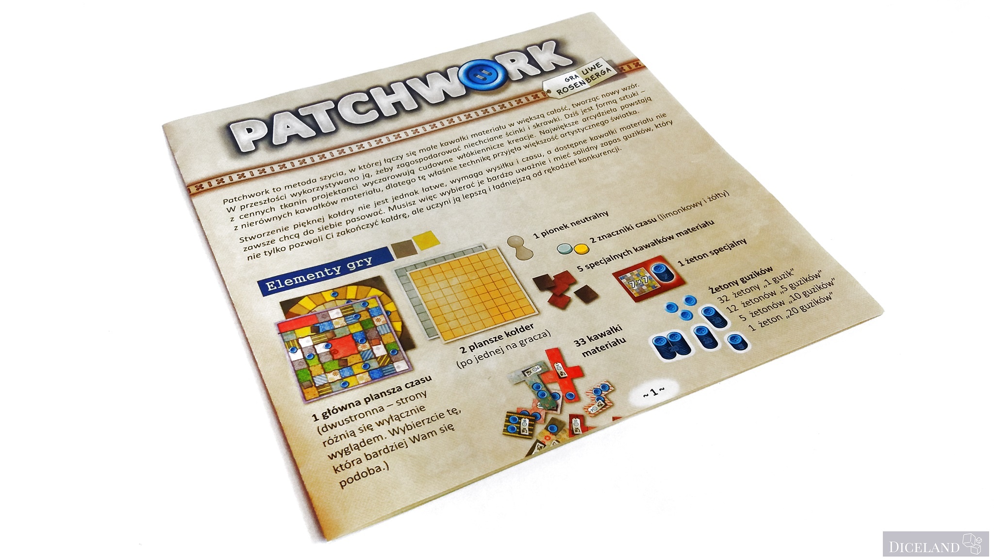 Gra Patchwork została stworzona tylko i wyłącznie do rozgrywki dwuosobowej. W grze będziemy zdobywali kolejne kawałki materiałów, które pozwolą nam na powiększanie naszej kołderki. W grze będziemy ponosili koszty za materiały – w guzikach i w czasie. Gracz, który uszyje największą kołderkę, zbierze dużą ilość guzików i odpowiednio dobrze wykorzysta swój czas, zostanie zwycięzcą.