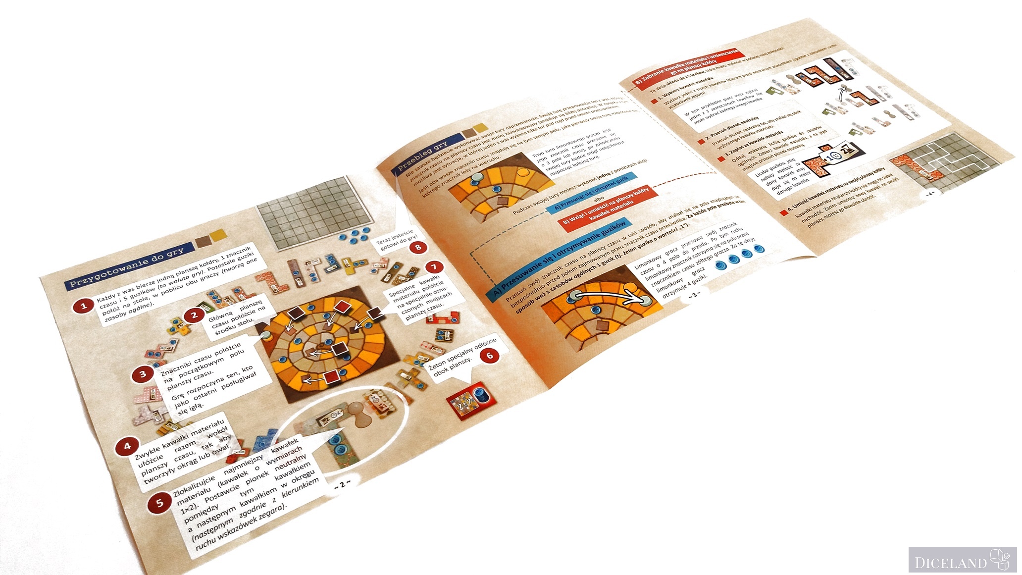 O tym, który z danych graczy wykonuje teraz ruch, decyduje oś czasu. Ruch wykonuje zawsze ten gracz, który jest ostatni na osi. Podoba mi się bardzo ten mechanizm, gdyż pozwala graczowi wykonać kilka ruchów z rzędu. Jest to możliwe w momencie, gdy nasz przeciwnik zdecydował się na duży skok w czasie, oszczędzając przy tym na guzikach. W odwecie możemy zrobić kilka ruchów i dorwać całkiem smaczne kąski, albo przesunąć nasz znacznik o jedno pole przed znacznik przeciwnika i pobrać odpowiednią premię w guziczkach. Równie dobry jest mechanizm łat, który nie pozwala się ociągać, gdyż każdy chce je mieć dla siebie. Na dokładkę mamy specjalny żeton, który trafi do gracza, któremu jako pierwszemu udało się zbudować obszar składający się z materiałów 7×7. Wyborów mamy wiele, każdy z nich może nas doprowadzić do zwycięstwa i jest to fantastyczne.