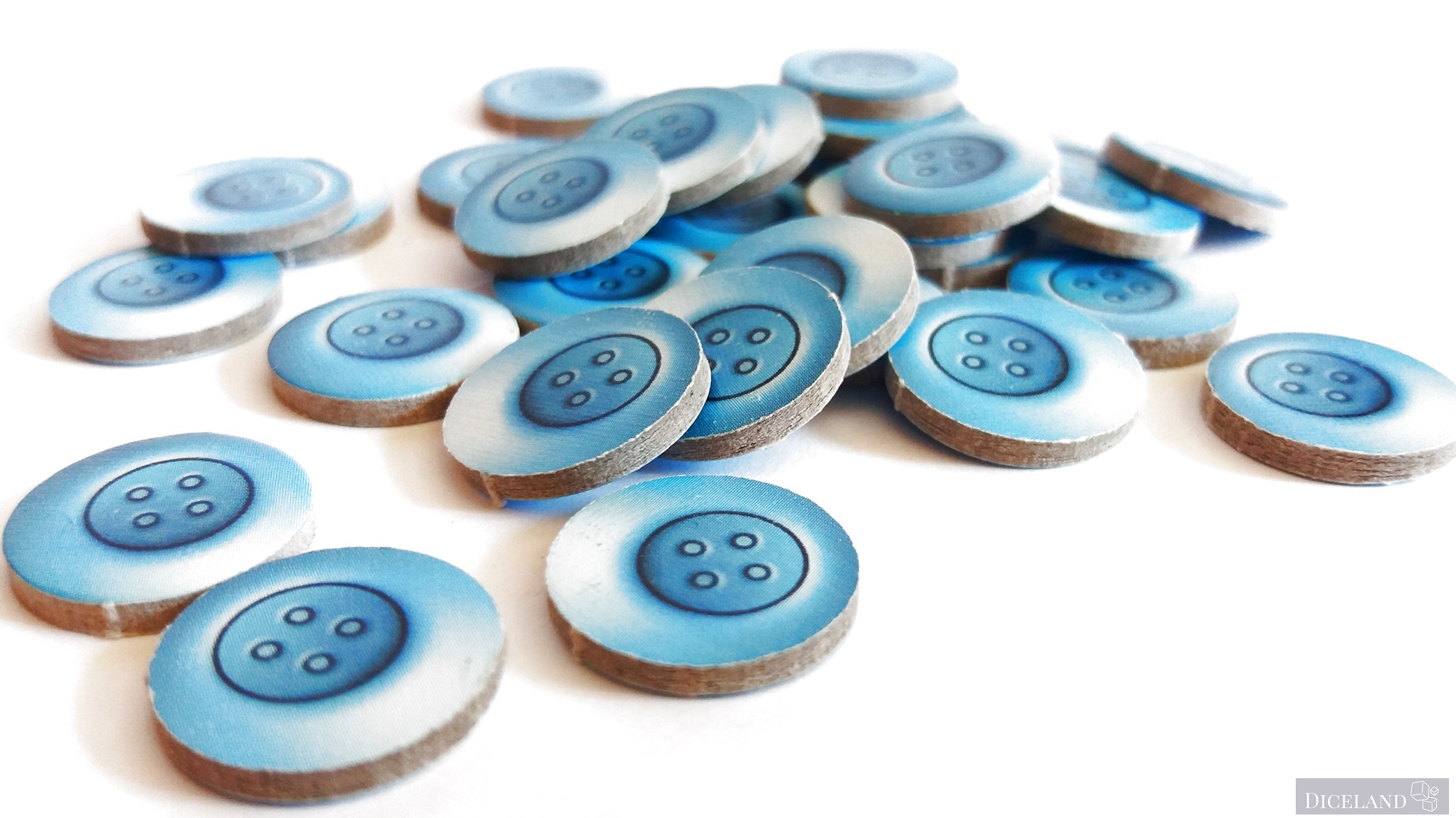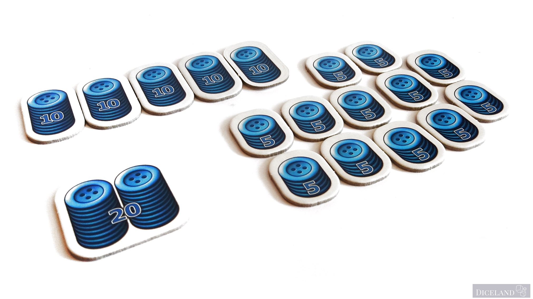 Żetony naśladujące guziczki, oraz mnożniki tych guziczków o wartości 5, 10, 20.