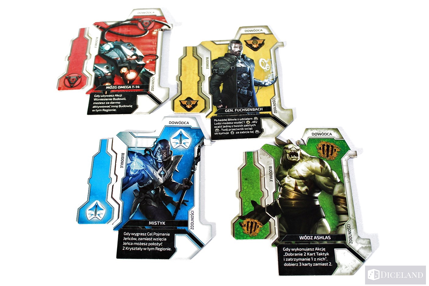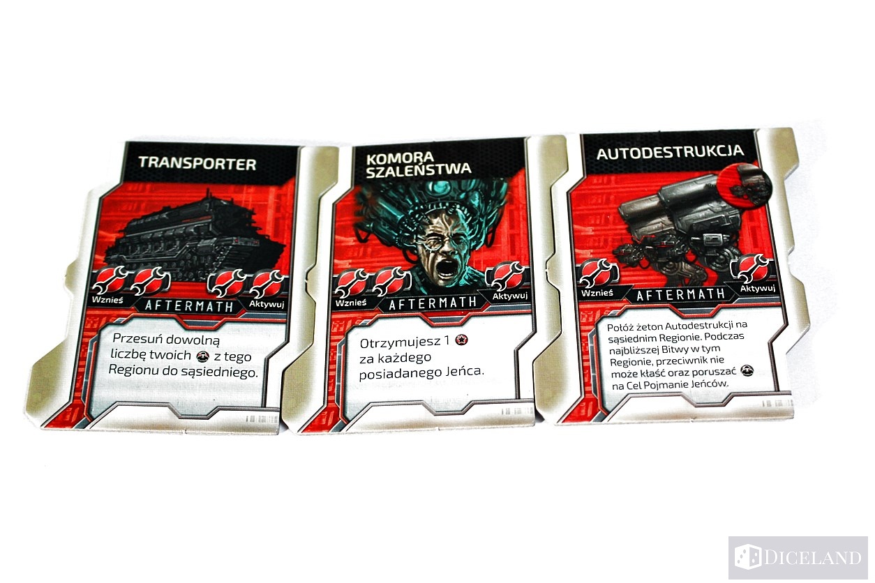Każda frakcja otrzyma 5 nowych kart zdolności, 3 płytki budynków oraz planszę dowódcy. Nie zapomniano również o przynależnych do nich żetonach. Elementy te podwajają możliwości, jakie daje nam każda z ras. Ponieważ plansza dowódcy jest dwustronna, do gry dołączono żetony łącznika, dzięki którym budowle będą nadal do niej idealnie dopasowane.