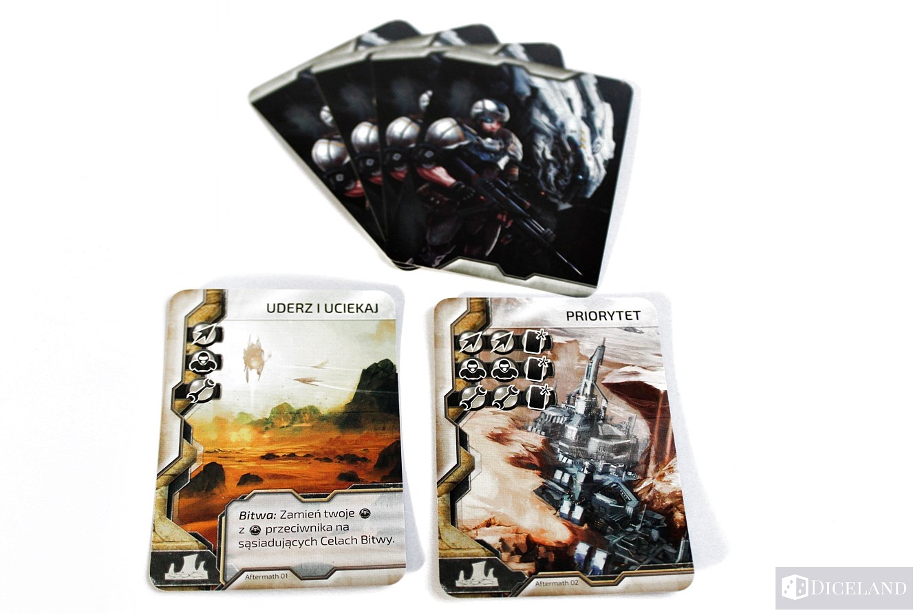 Dodatkowe karty taktyk terenowych są miłym dodatkiem, jednak nie wywarły na mnie większego wrażenia podczas rozgrywki. Mają one inny zestaw symboli niż karty podstawowe oraz nowe akcje do wykorzystania w trakcie bitwy.