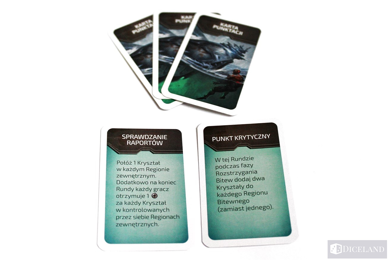Zdecydowanie lepiej wypadają nowe żetony wydarzeń i karty punktacji. To chyba najlepszy element dodatku. Żetony będą nakazywać nam dobranie karty punktacji ze stosu. Te z kolei dodadzą ciekawy, krótkoterminowy sposób na zdobywanie punktów. Może się na przykład okazać, że w nadchodzącej rundzie otrzymamy nagrodę za kontrolowanie brzegowych regionów na planszy. Zdecydowanie zwiększy to ich atrakcyjność i skieruje wzrok graczy w tamtą stronę. Taki zabieg mocno uatrakcyjnia rozgrywkę.