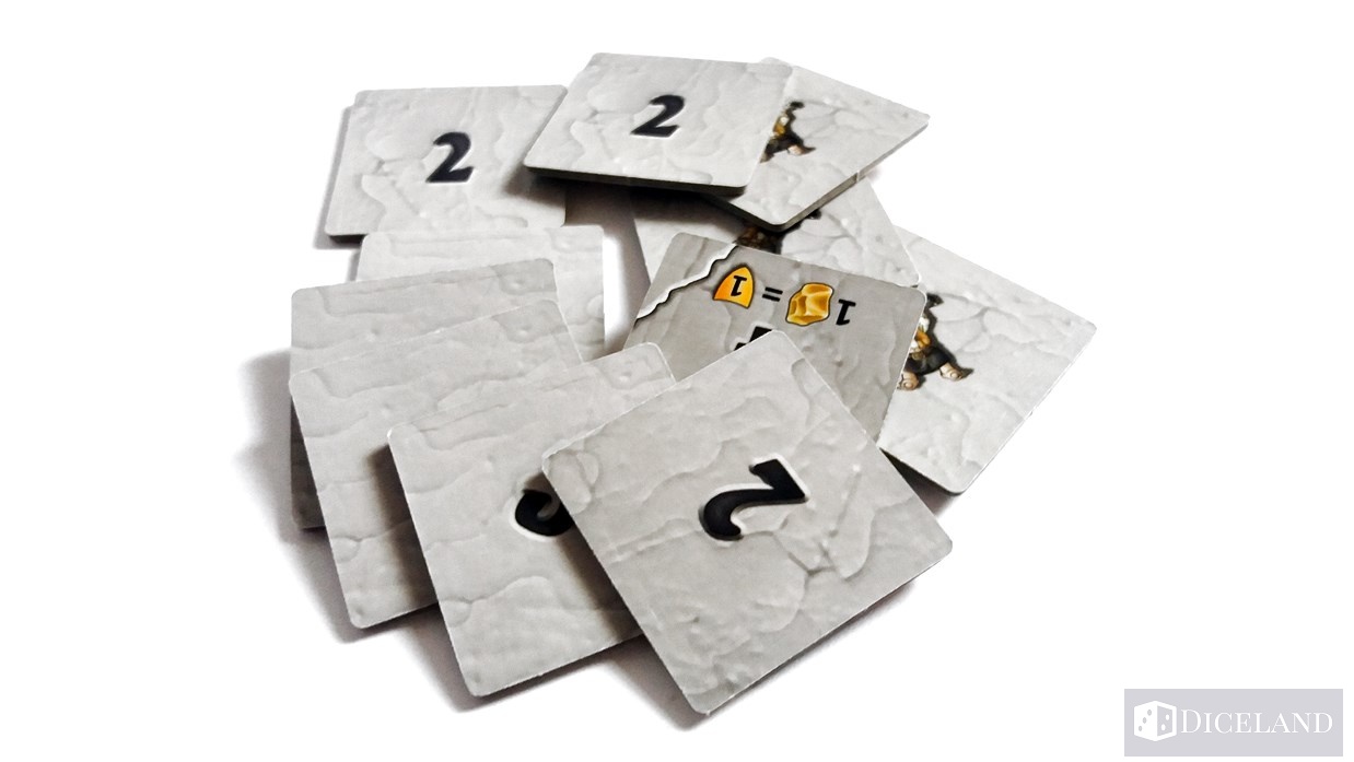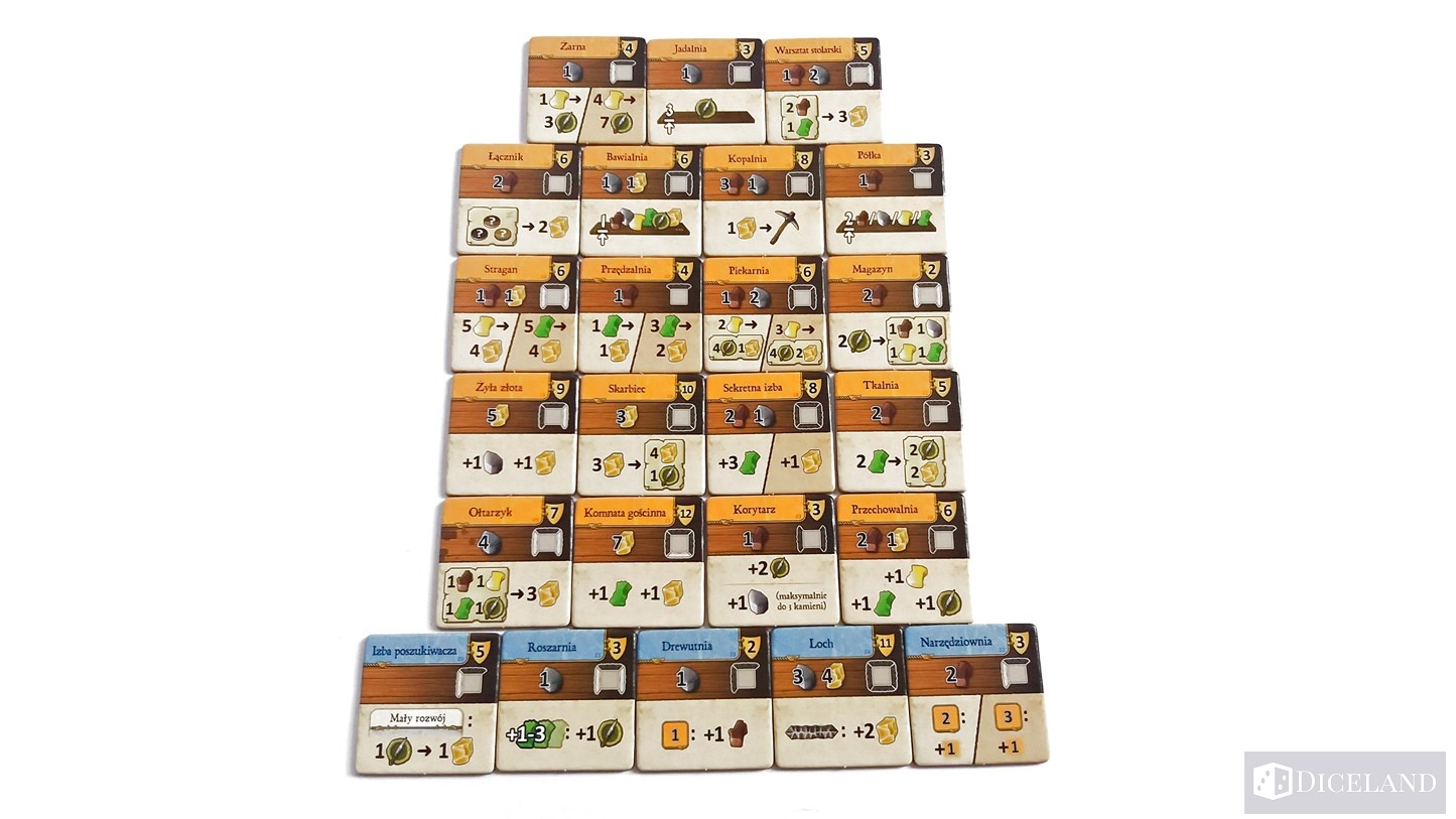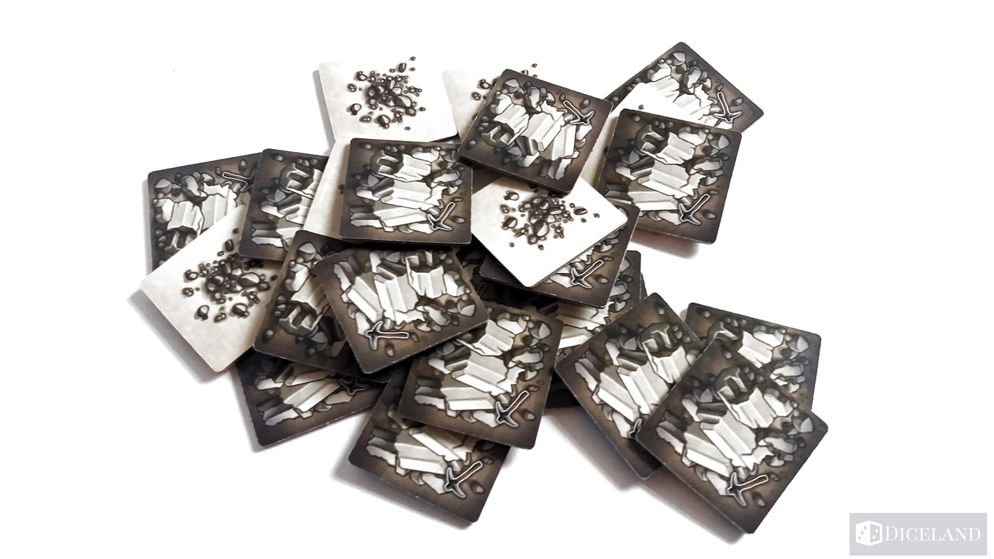 Głównym elementem rozgrywki są jednak dwustronne kafelki, którymi początkowo zasypujemy nasze groty mieszkalne. Na ich awersach widnieją najróżniejsze izby, które będą tworzyły opracowany przez nas silniczek produkcyjny. Otrzymujemy kafelki, z których musimy skorzystać bezpośrednio, kafelki, które działają pasywnie oraz takie, które umieścimy na torze rund. Dzięki nim będziemy mogli skorzystać z pewnych akcji. Kafelki te są nie tylko czytelne, ale także solidnie wykonane. Jednak jeśli chodzi o grafikę, to ich rewersy są znacznie bardziej klimatyczne od awersów. Przód kafelka w niczym nie przypomina nowo wybudowanej izby.
