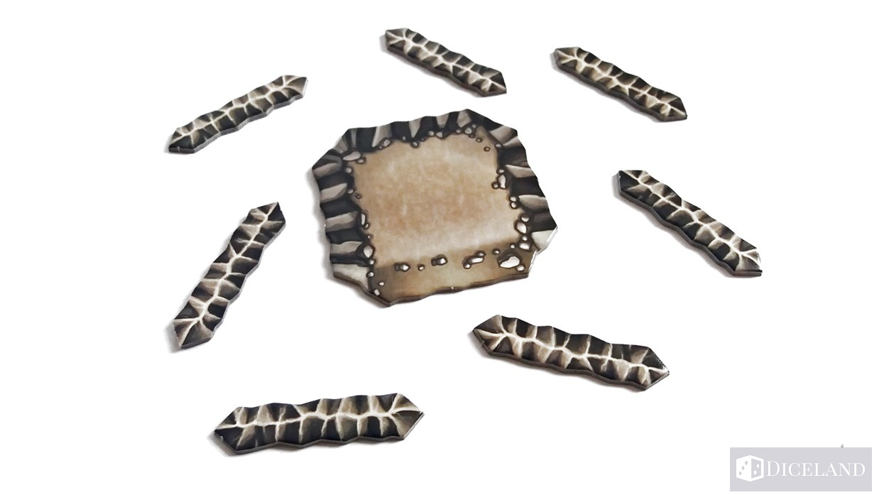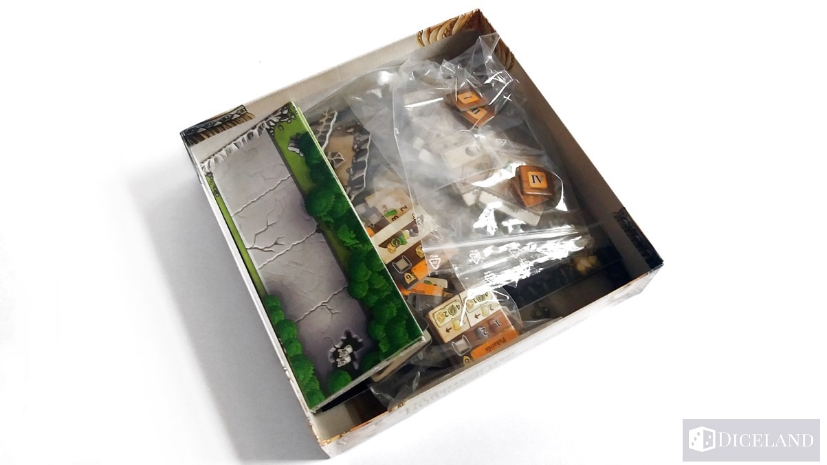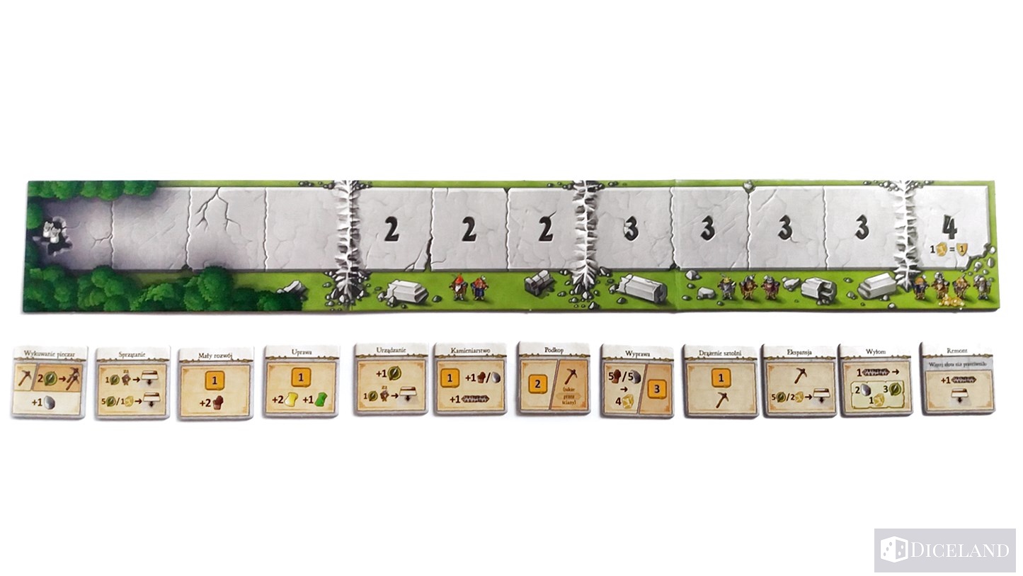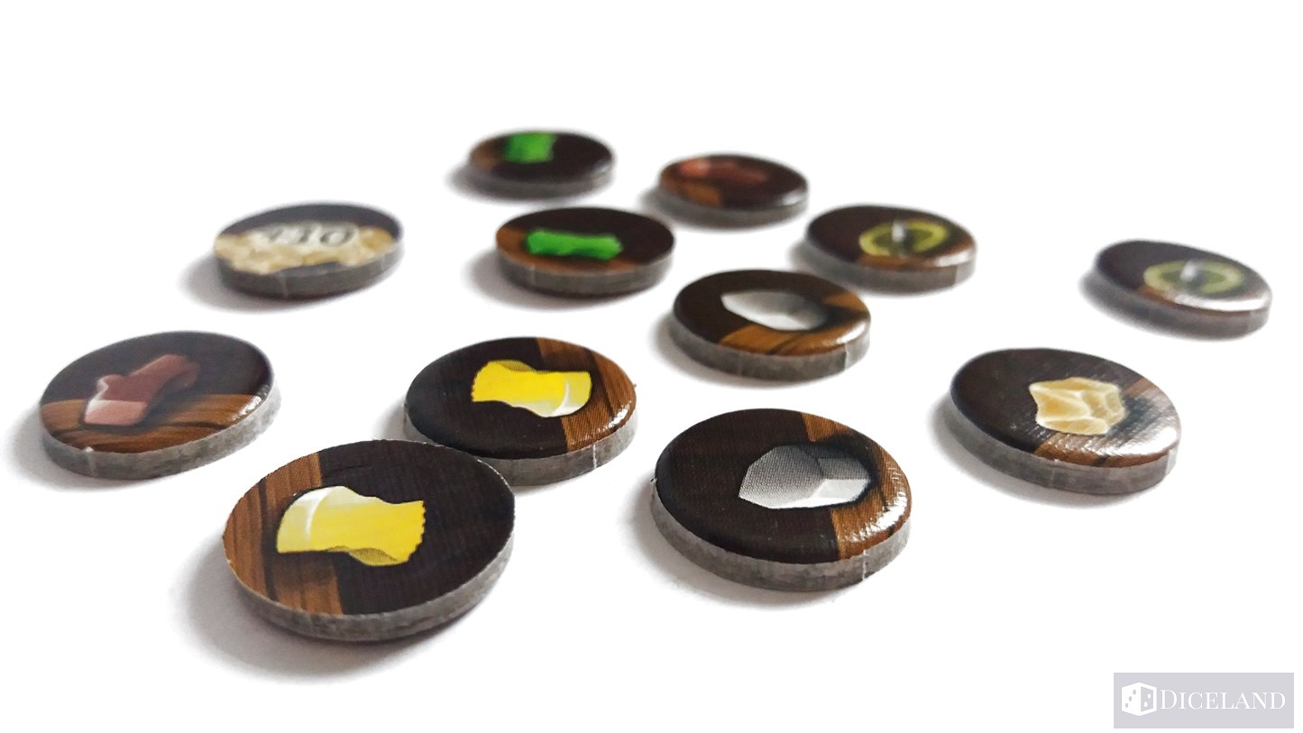 Głównym elementem rozgrywki są jednak dwustronne kafelki, którymi początkowo zasypujemy nasze groty mieszkalne. Na ich awersach widnieją najróżniejsze izby, które będą tworzyły opracowany przez nas silniczek produkcyjny. Otrzymujemy kafelki, z których musimy skorzystać bezpośrednio, kafelki, które działają pasywnie oraz takie, które umieścimy na torze rund. Dzięki nim będziemy mogli skorzystać z pewnych akcji. Kafelki te są nie tylko czytelne, ale także solidnie wykonane. Jednak jeśli chodzi o grafikę, to ich rewersy są znacznie bardziej klimatyczne od awersów. Przód kafelka w niczym nie przypomina nowo wybudowanej izby.