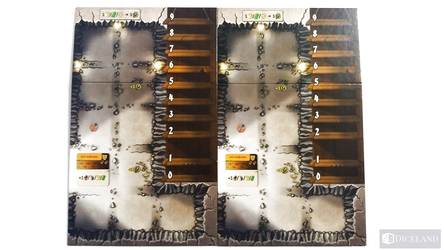 Kolejnymi elementami są plansze dla graczy, które przedstawiają tytułową jaskinię. Na planszy tej znajdziemy grotę, na której będziemy umieszczali kafelki z nowo wybudowanymi izbami. Zanim jednak do tego dojdzie, będziemy musieli chwycić za kilof i wydrążyć co nieco skał. Na planszy tej znalazło się również miejsce na licznik naszych dóbr. Sprawdza się on niemalże doskonale. Na odwrocie tych plansz znajdziemy pewne ilustracje. Po połączeniu obu, ujrzymy tę samą grafikę co na okładce. Szkoda tylko, że tytuł gry pozostał oryginalny, a nie ten, który znamy z polskiego wydania.