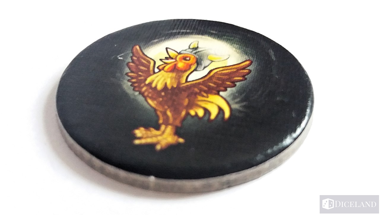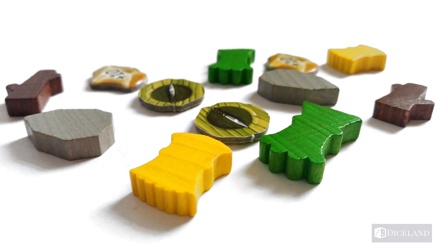 Pozostałe elementy to: znacznik pierwszego gracza z grafiką koguta, dodatkowy kafelek pieczary, żetony ścian, oraz dwojakie żetony do zaznaczania aktualnych zasobów. Otrzymujemy tradycyjne znaczniki, jak również drewniane elementy. To, z których skorzystamy, zależy wyłącznie od naszych preferencji. Jeśli wolicie ładniejsze elementy, to z pewnością skorzystacie z drewnianych odpowiedników, jednak o wiele bardziej praktyczne są żetony. Dodatkowo do naszej dyspozycji oddano 4 znaczniki akcji do zaznaczania aktualnie wykonanych ruchów, dzięki nim z pewnością się nie pogubimy.